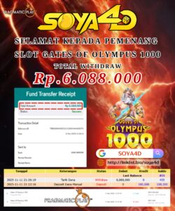 Selamat kepada User id : NMA***** Telah berhasil mendapatkan kemenangan besar pada permainan SLOT GATES OF OLYMPUS 1000 Dengan kemenangan Sebesar Rp.6.088.000.-,Setelah mengisi formulir withdraw dengan kurung waktu hanya 1 – 10 menit pihak SOYA 4D sudah melakukan transfer kepada pemiliknya dan dana sudah masuk ke rekeNing id tersebut oleh pemenang. Bukti pembayaran yang kami berikan merupakan bukti pembayaran yang SAH / VALID yang langsung di dapatkan melalui tanda transfer transaksi berhasil dari Bank yang di tuju.