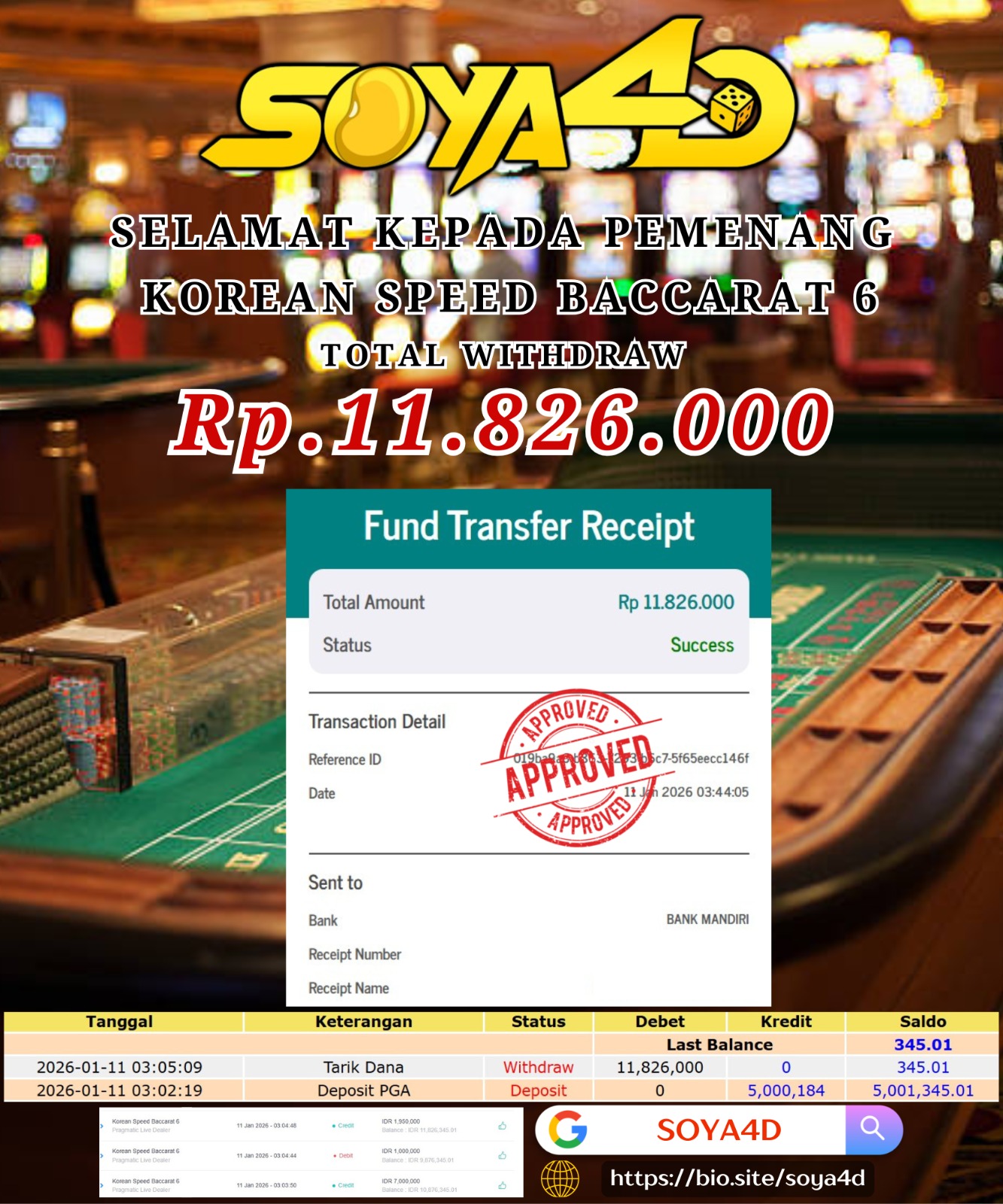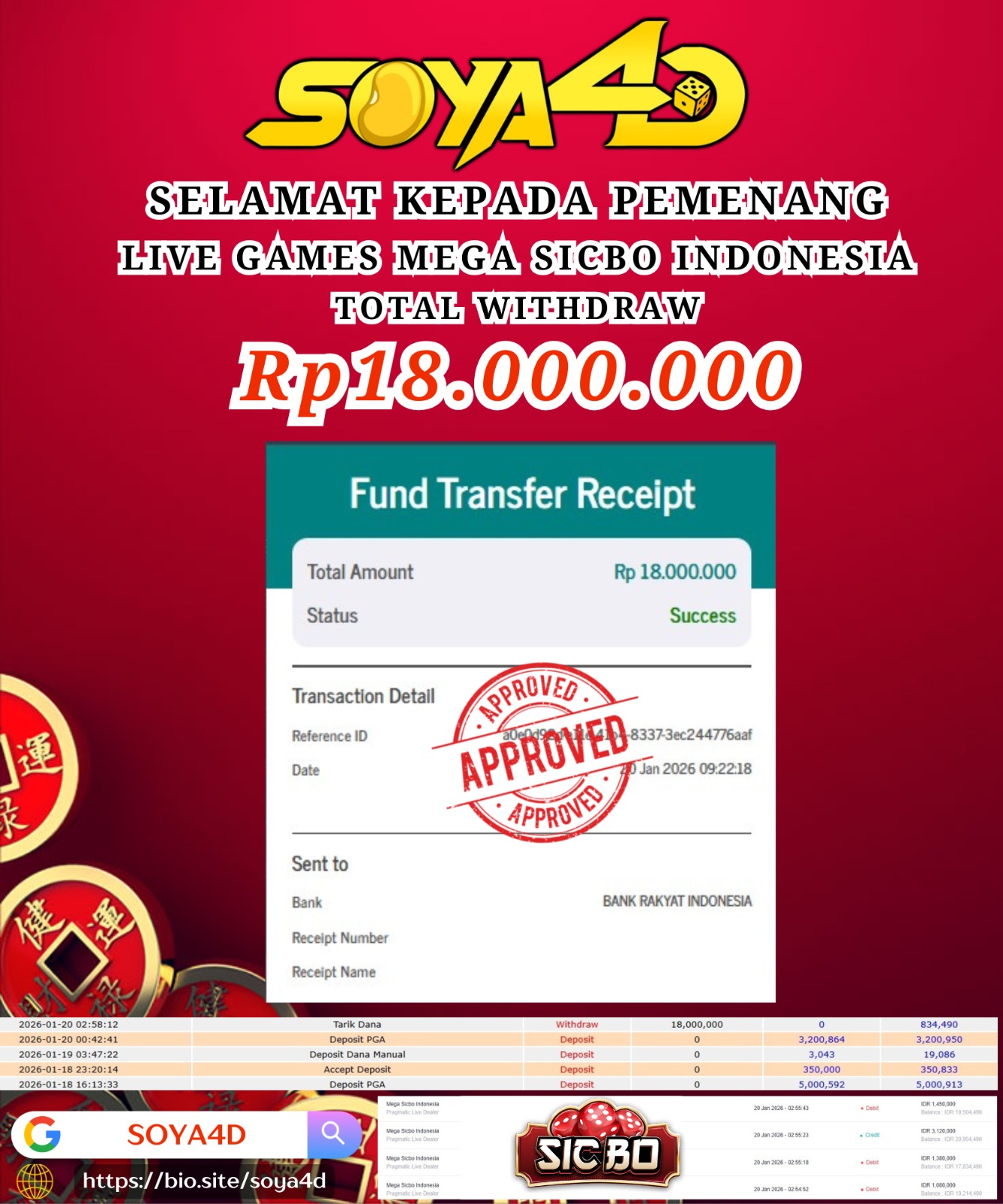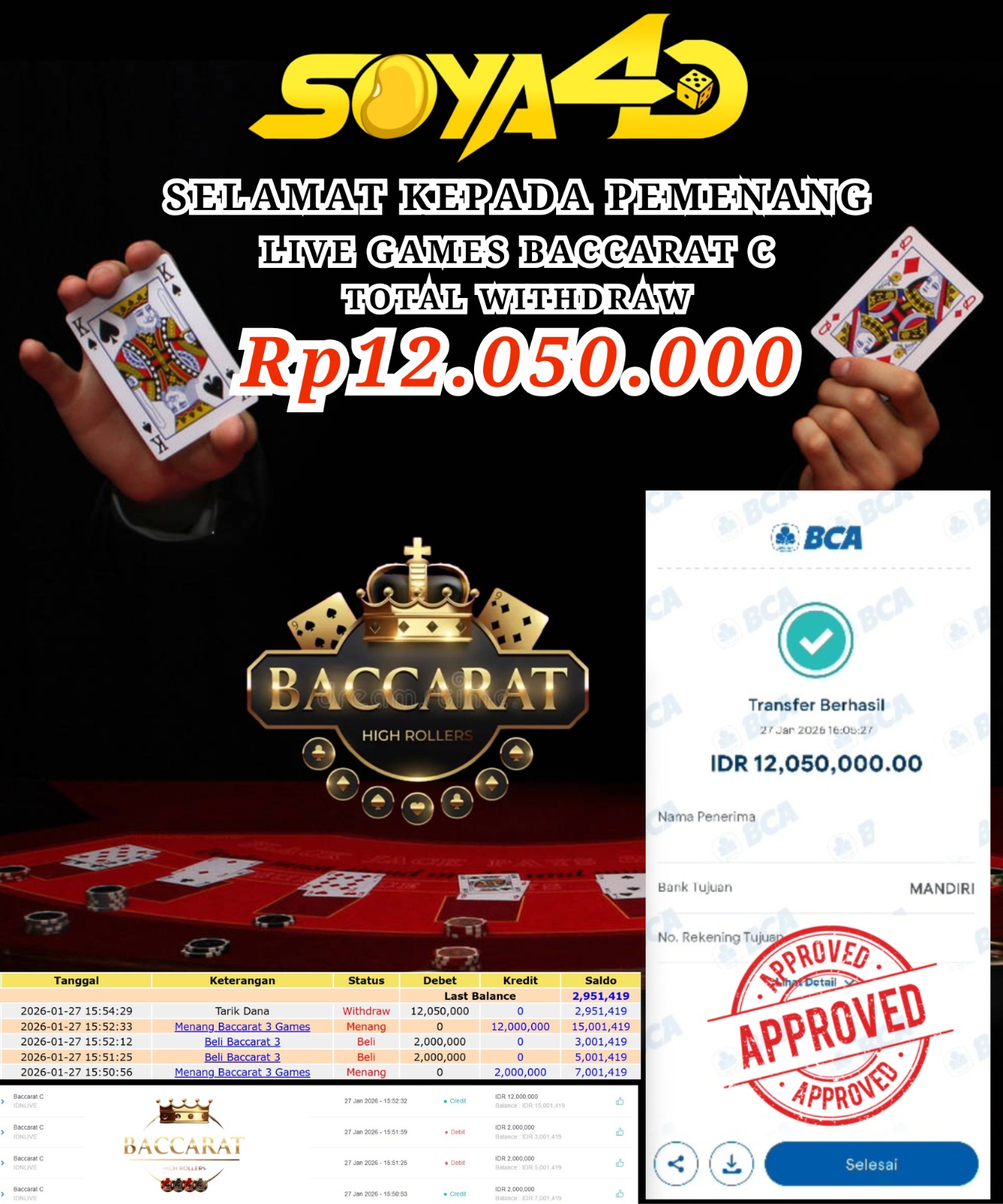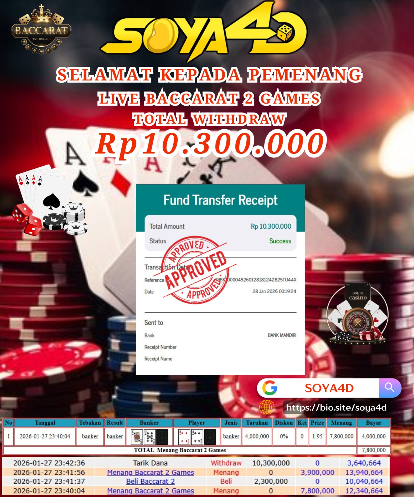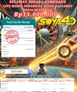Selamat kepada Userid : Gle**** Telah berhasil mendapatkan kemenangan besar pada permainan LIVE GAMES MANIA INDONESIAN SPEED BACCARAT . Dengan kemenangan Sebesar Rp. 21.438.000.-. Setelah mengisi formulir withdraw dengan kurang waktu hanya 1 – 10 menit pihak SOYA4D sudah melakukan transfer kepada pemilik user id. Dan dana sudah masuk ke rekening id tersebut oleh pemenang. Bukti pembayaran yang kami berikan merupakan bukti pembayaran yang SAH / VALID yang langsung di dapatkan melalui tanda transfer transaksi berhasil dari Bank yang di tuju. Kami juga mengucapakan banyak Terima Kasih Kepada pemenang karena sudah mempercayakan kami sebagai Bandar Tepercaya yang membayar semua kemenangan member hingga lunas.