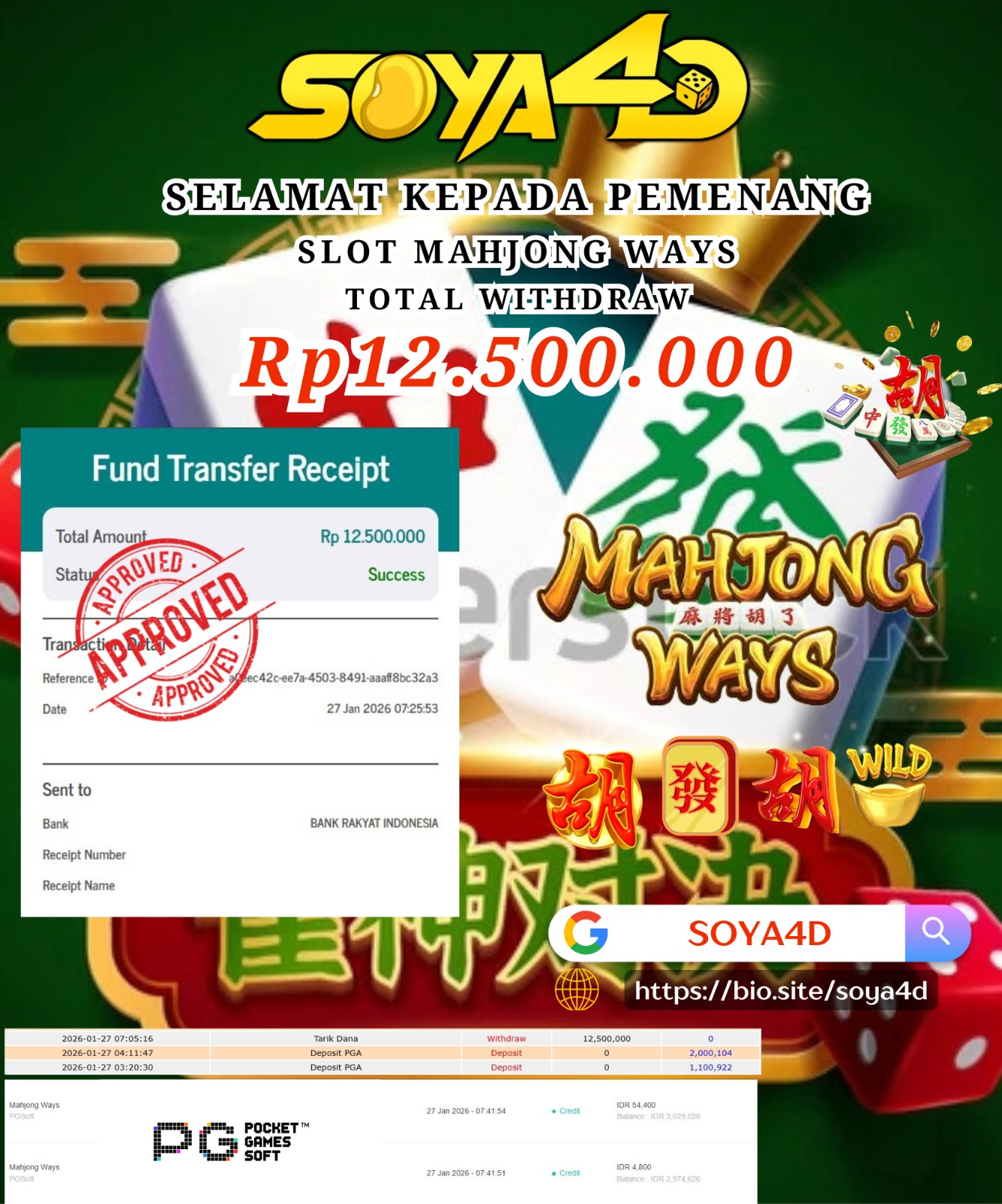 Selamat kepada Userid : Dio**** Telah berhasil mendapatkan kemenangan besar pada permainan SLOT MAHJONG WAYS. Dengan kemenangan Sebesar Rp. 17.000.000.-. Setelah mengisi formulir withdraw dengan kurang waktu hanya 1 – 10 menit pihak SOYA4D sudah melakukan transfer kepada pemilik user id. Dan dana sudah masuk ke rekening id tersebut oleh pemenang. Bukti pembayaran yang kami berikan merupakan bukti pembayaran yang SAH / VALID yang langsung di dapatkan melalui tanda transfer transaksi berhasil dari Bank yang di tuju. Kami juga mengucapakan banyak Terima Kasih Kepada pemenang karena sudah mempercayakan kami sebagai Bandar Tepercaya yang membayar semua kemenangan member hingga lunas.