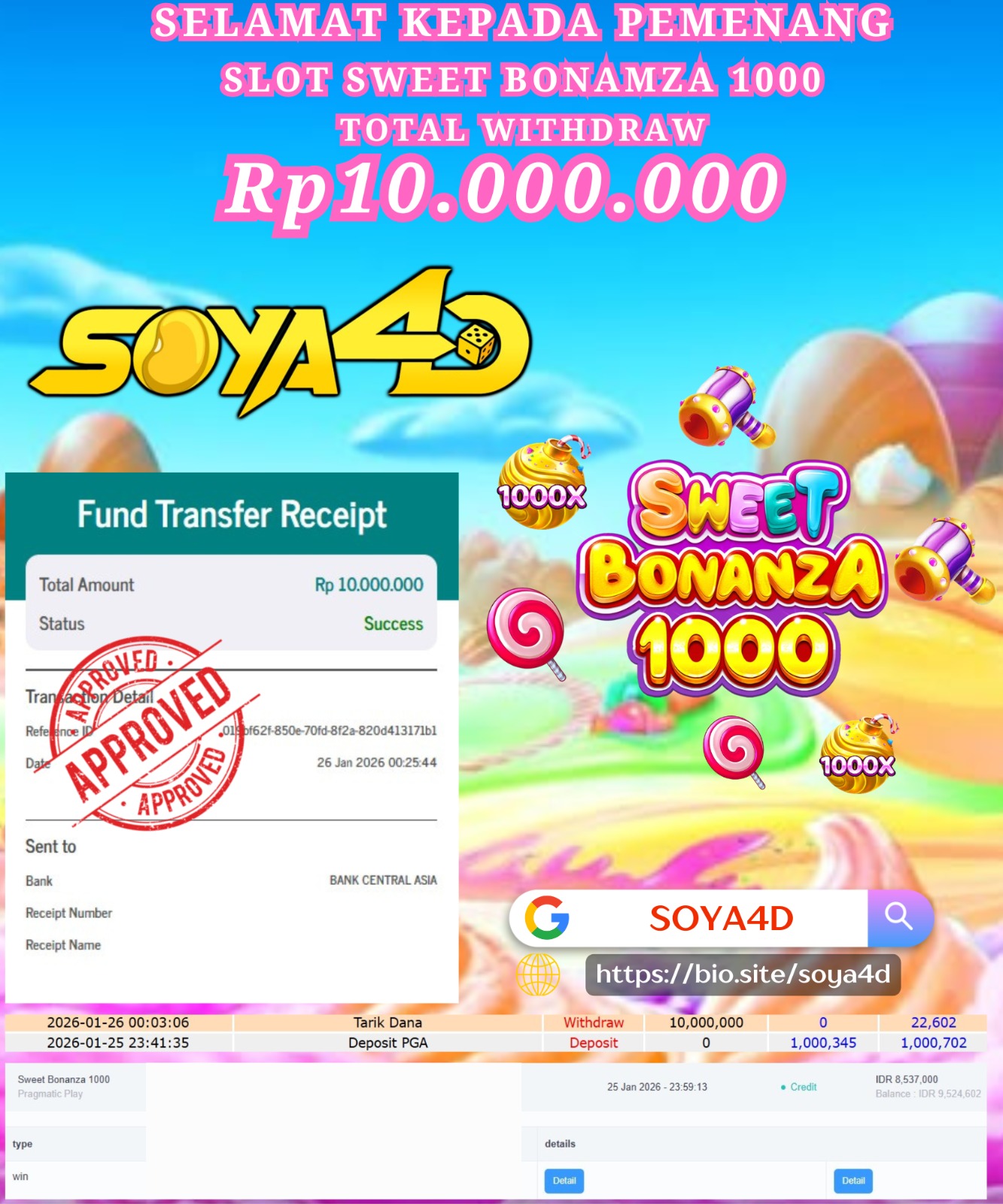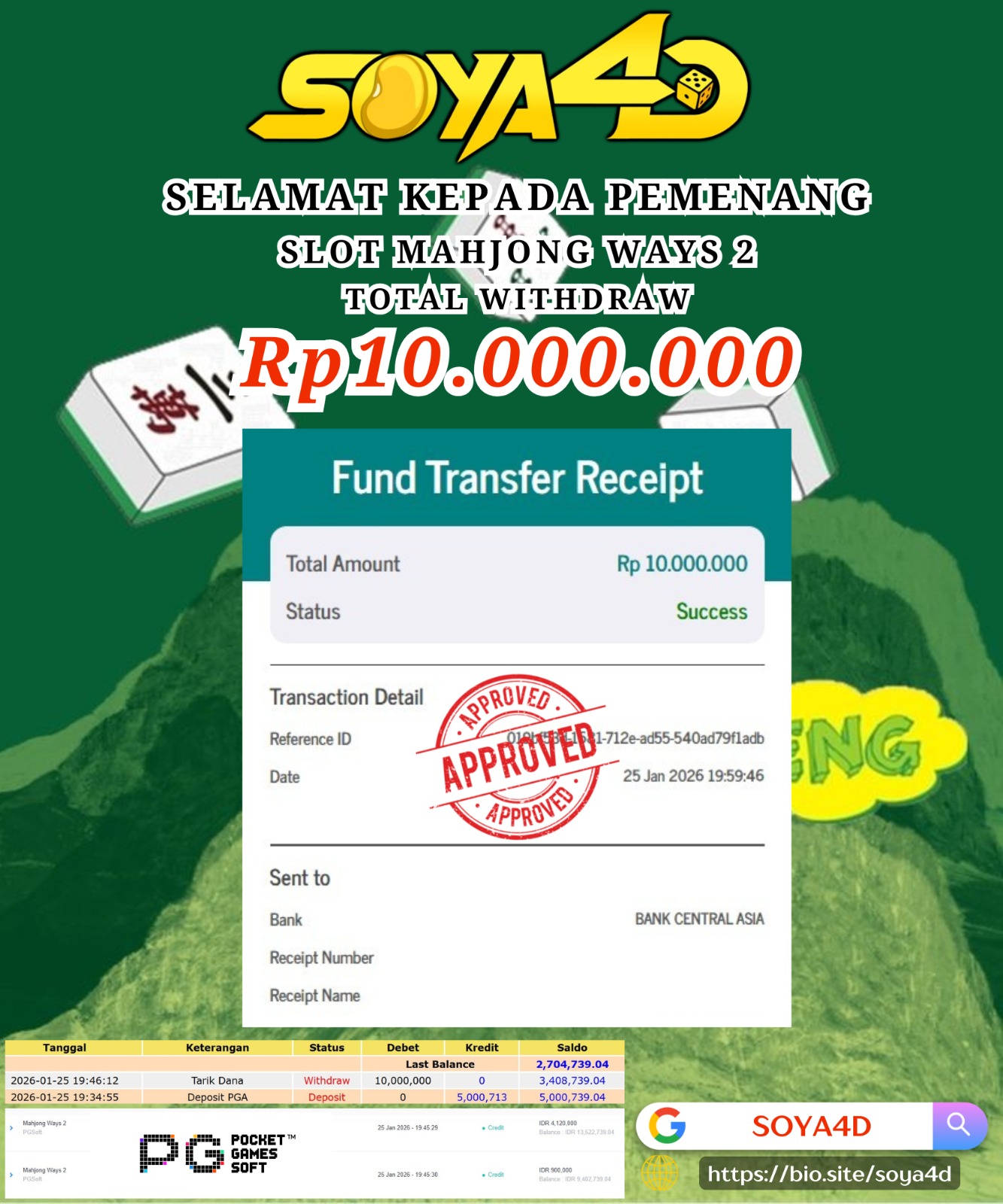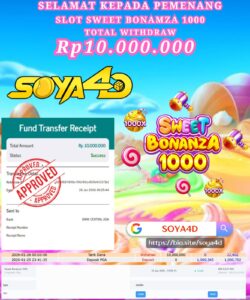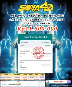 Selamat kepada Userid : KIG**** Telah berhasil mendapatkan kemenangan besar pada permainan SLOT WILD BANDITO . Dengan kemenangan Sebesar Rp. 10.000.000.-. Setelah mengisi formulir withdraw dengan kurang waktu hanya 1 – 10 menit pihak SOYA4D sudah melakukan transfer kepada pemilik user id. Dan dana sudah masuk ke rekening id tersebut oleh pemenang. Bukti pembayaran yang kami berikan merupakan bukti pembayaran yang SAH / VALID yang langsung di dapatkan melalui tanda transfer transaksi berhasil dari Bank yang di tuju. Kami juga mengucapakan banyak Terima Kasih Kepada pemenang karena sudah mempercayakan kami sebagai Bandar Tepercaya yang membayar semua kemenangan member hingga lunas.