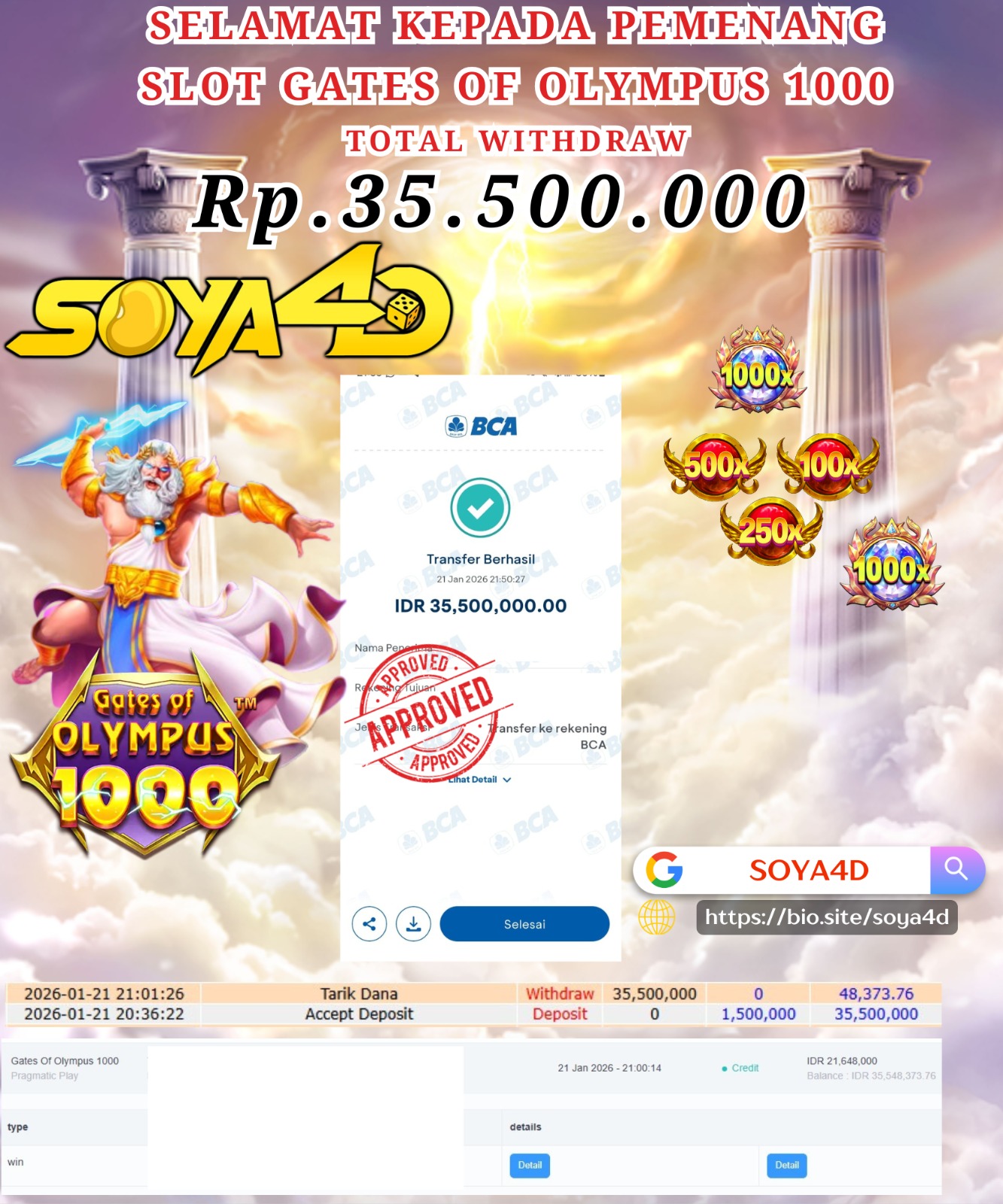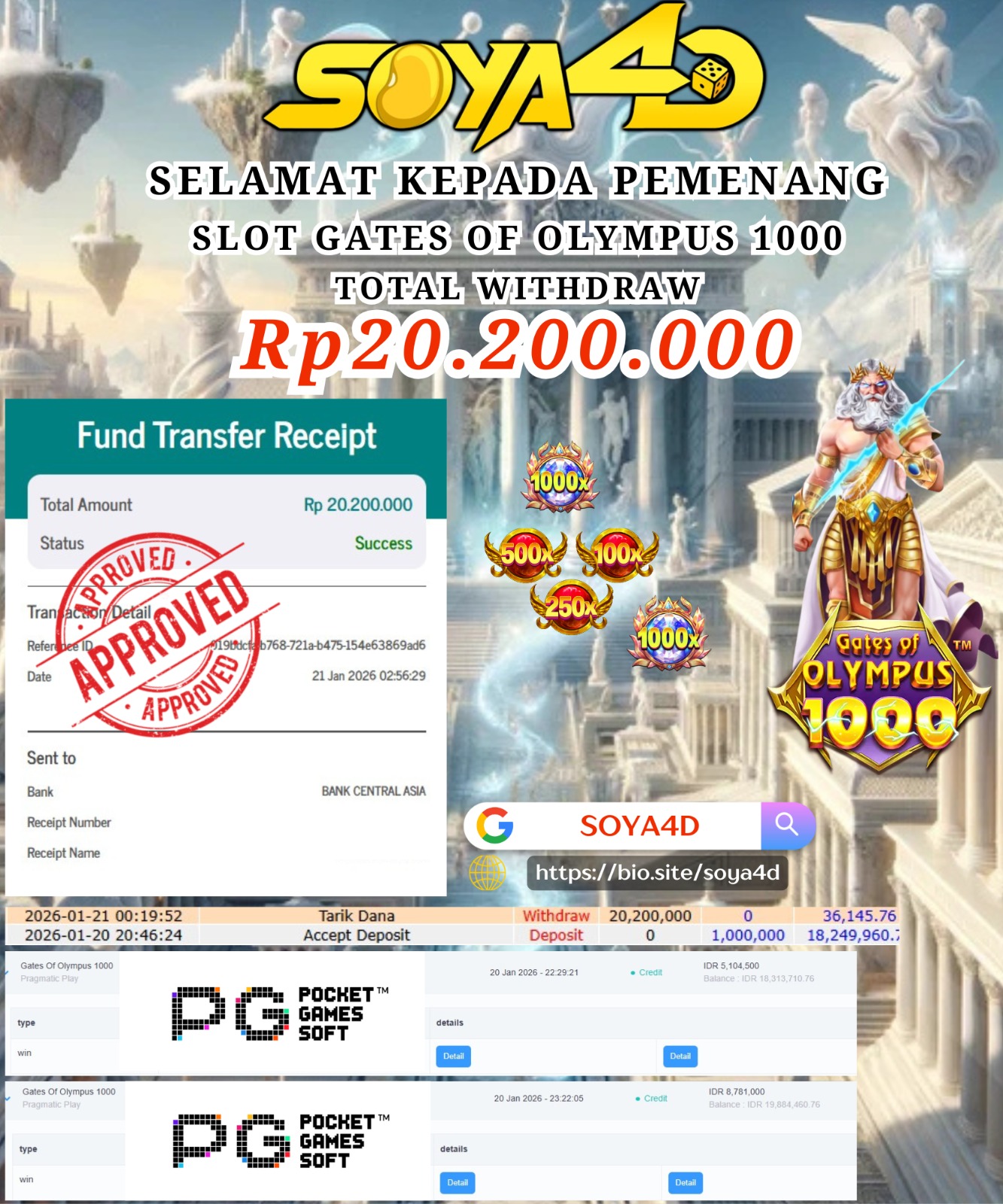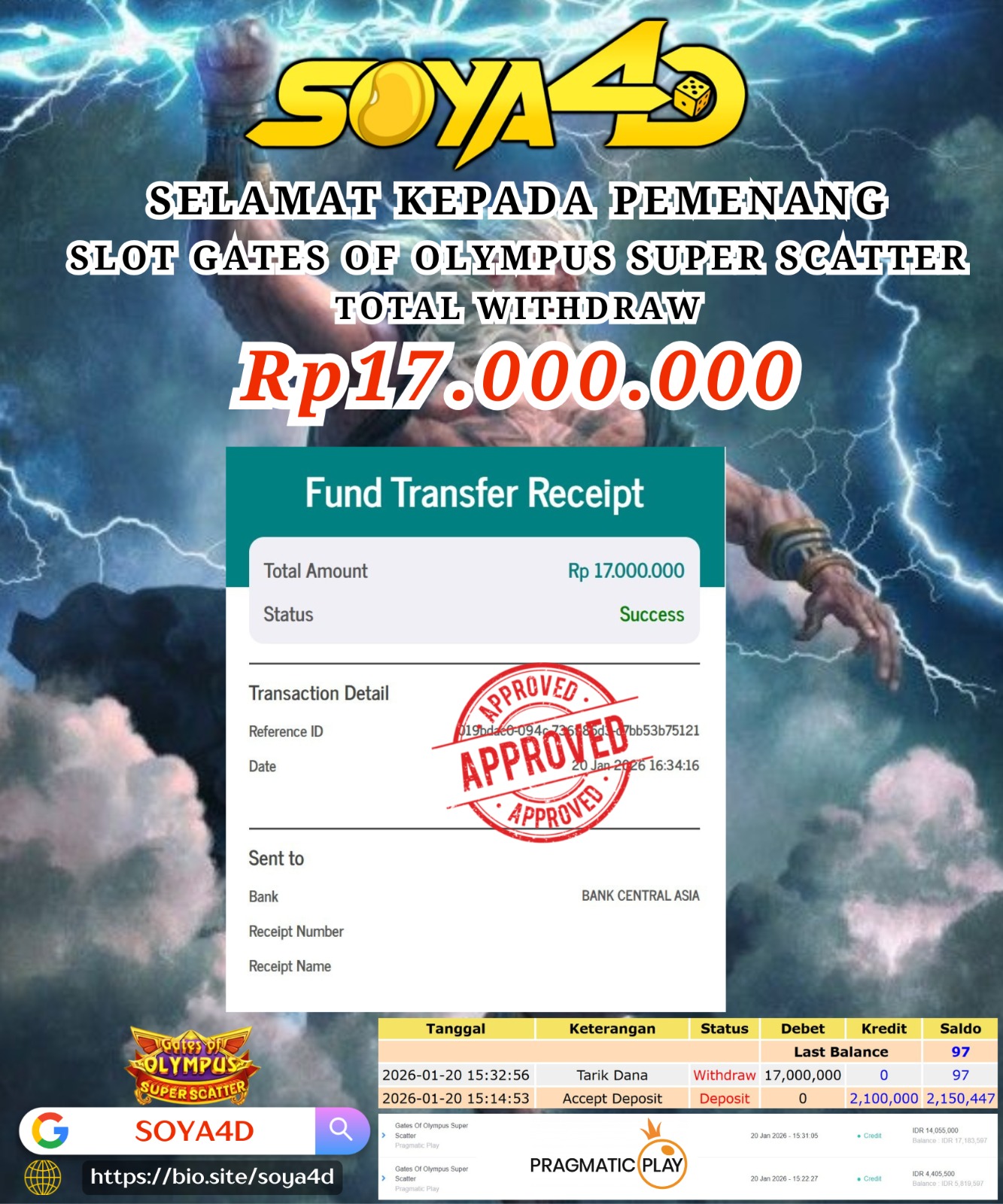 Selamat kepada Userid : UUI**** Telah berhasil mendapatkan kemenangan besar pada permainan CURSE OF THE PYRAMID. Dengan kemenangan Sebesar Rp. 10.000.000.-. Setelah mengisi formulir withdraw dengan kurang waktu hanya 1 – 10 menit pihak SOYA4D sudah melakukan transfer kepada pemilik user id. Dan dana sudah masuk ke rekening id tersebut oleh pemenang. Bukti pembayaran yang kami berikan merupakan bukti pembayaran yang SAH / VALID yang langsung di dapatkan melalui tanda transfer transaksi berhasil dari Bank yang di tuju. Kami juga mengucapakan banyak Terima Kasih Kepada pemenang karena sudah mempercayakan kami sebagai Bandar Tepercaya yang membayar semua kemenangan member hingga lunas.