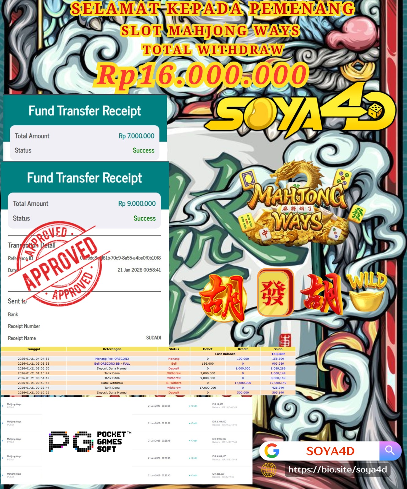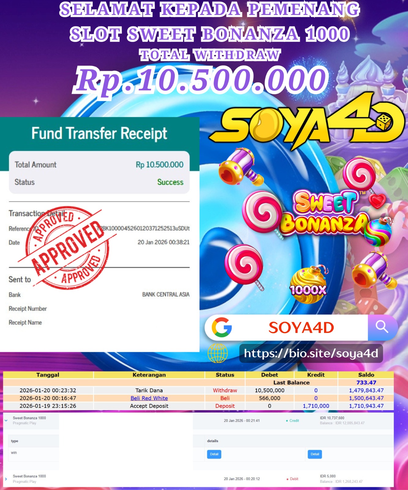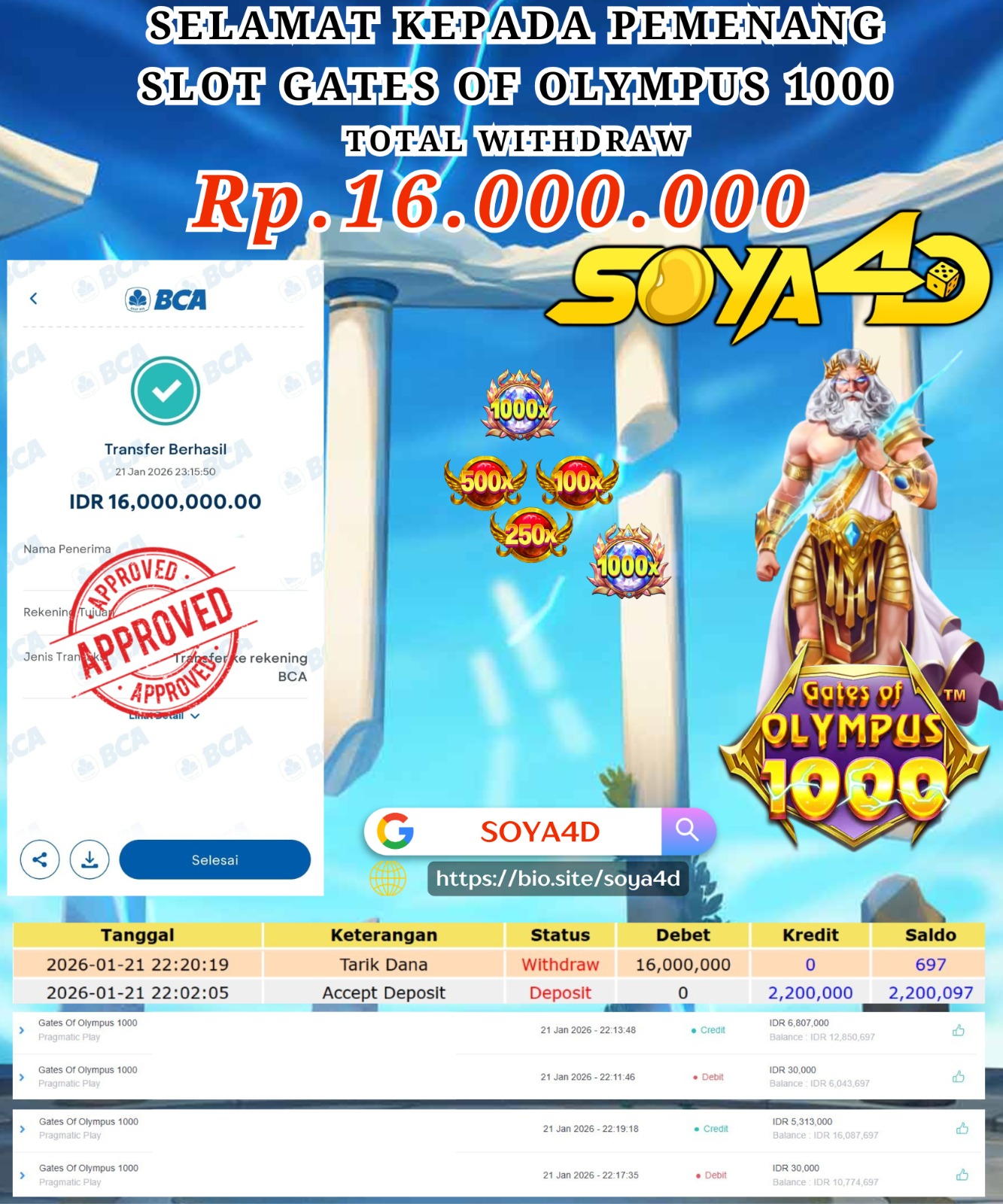 Selamat kepada Userid : UUI**** Telah berhasil mendapatkan kemenangan besar pada permainan CURSE OF THE PYRAMID. Dengan kemenangan Sebesar Rp. 10.000.000.-. Setelah mengisi formulir withdraw dengan kurang waktu hanya 1 – 10 menit pihak SOYA4D sudah melakukan transfer kepada pemilik user id. Dan dana sudah masuk ke rekening id tersebut oleh pemenang. Bukti pembayaran yang kami berikan merupakan bukti pembayaran yang SAH / VALID yang langsung di dapatkan melalui tanda transfer transaksi berhasil dari Bank yang di tuju. Kami juga mengucapakan banyak Terima Kasih Kepada pemenang karena sudah mempercayakan kami sebagai Bandar Tepercaya yang membayar semua kemenangan member hingga lunas.