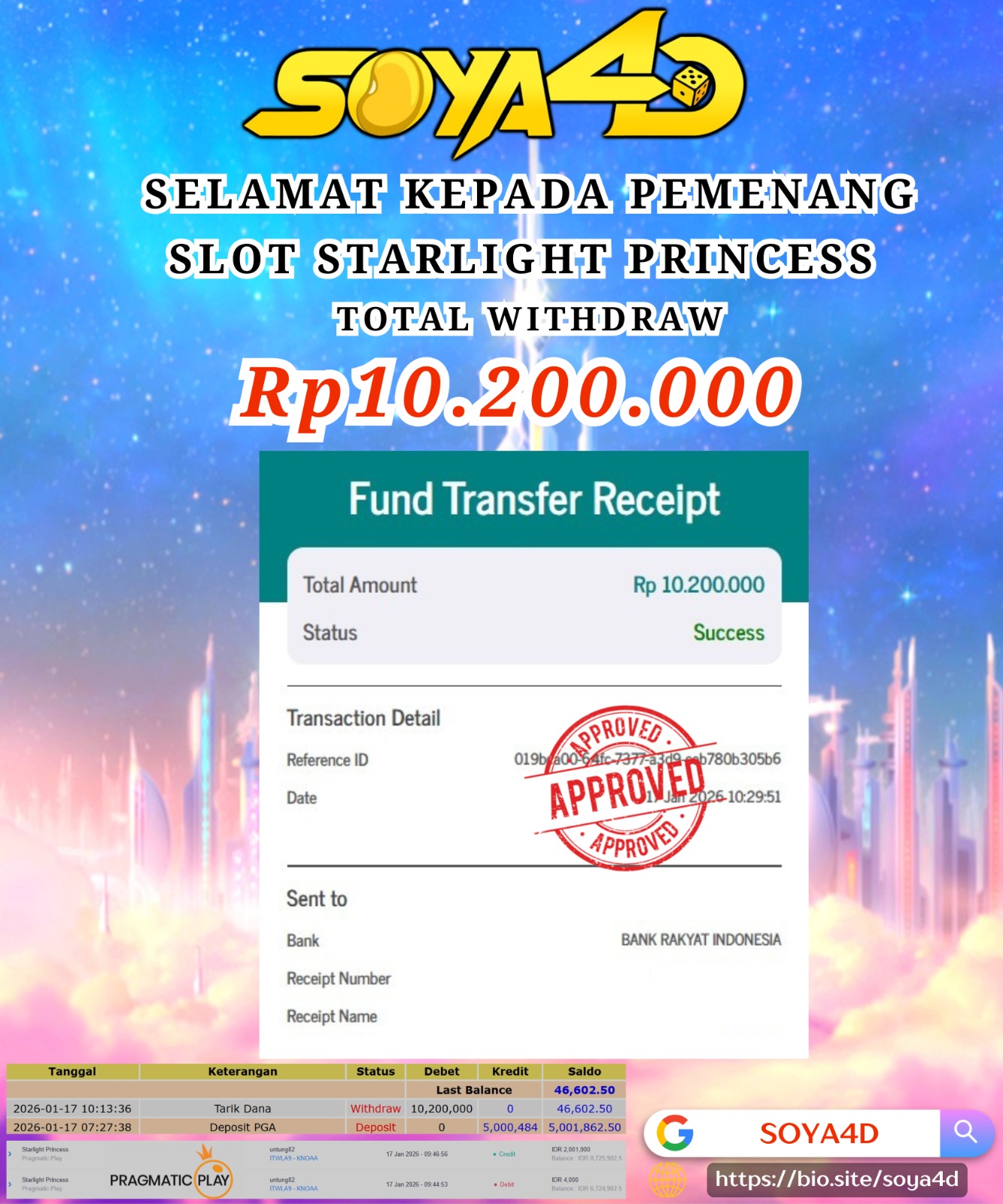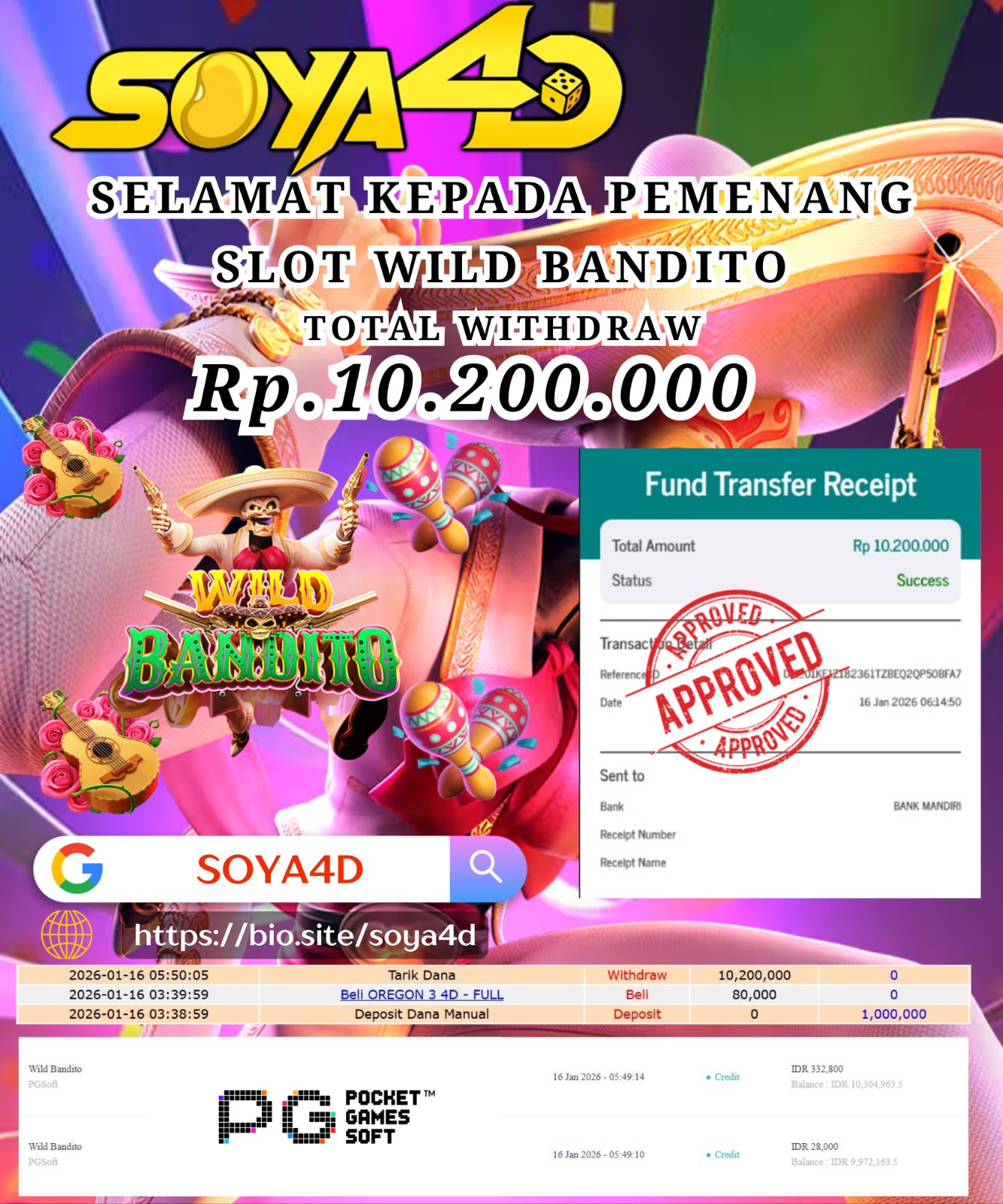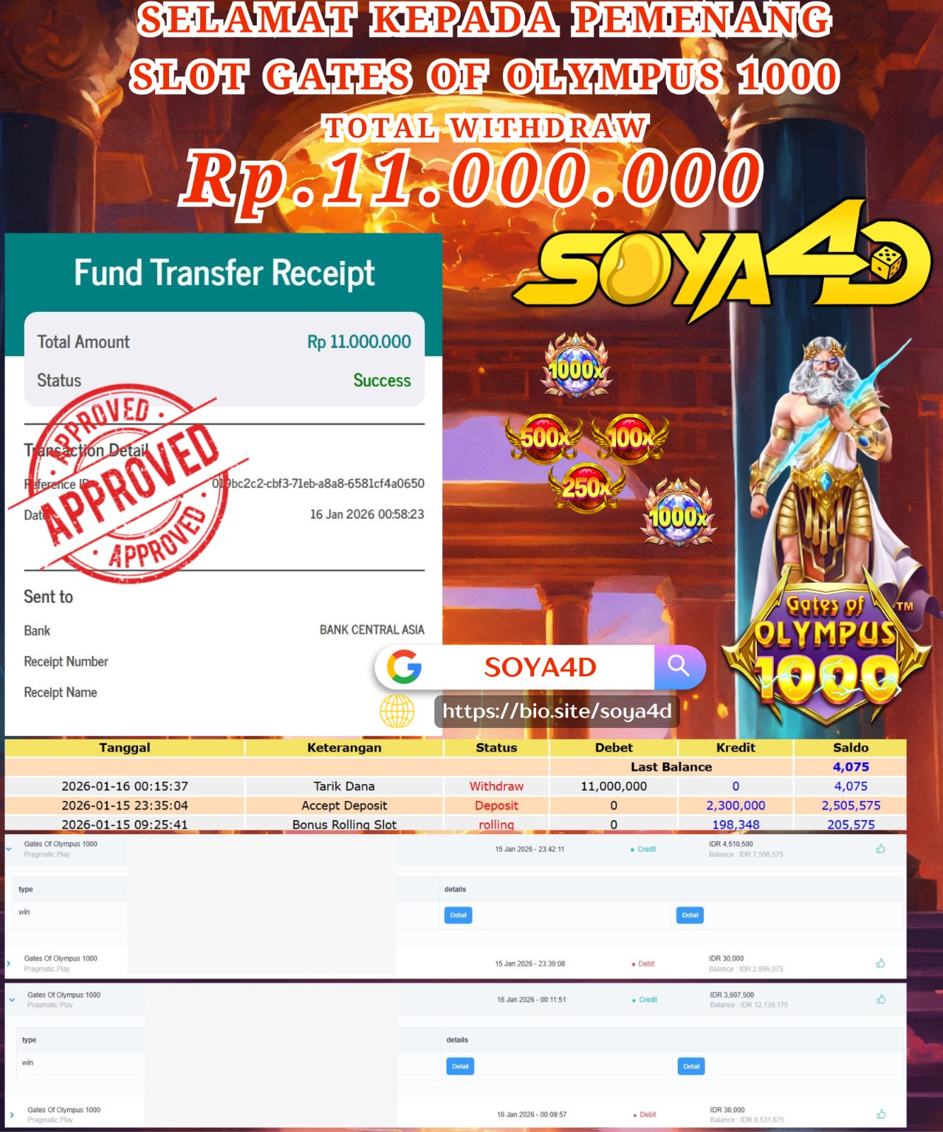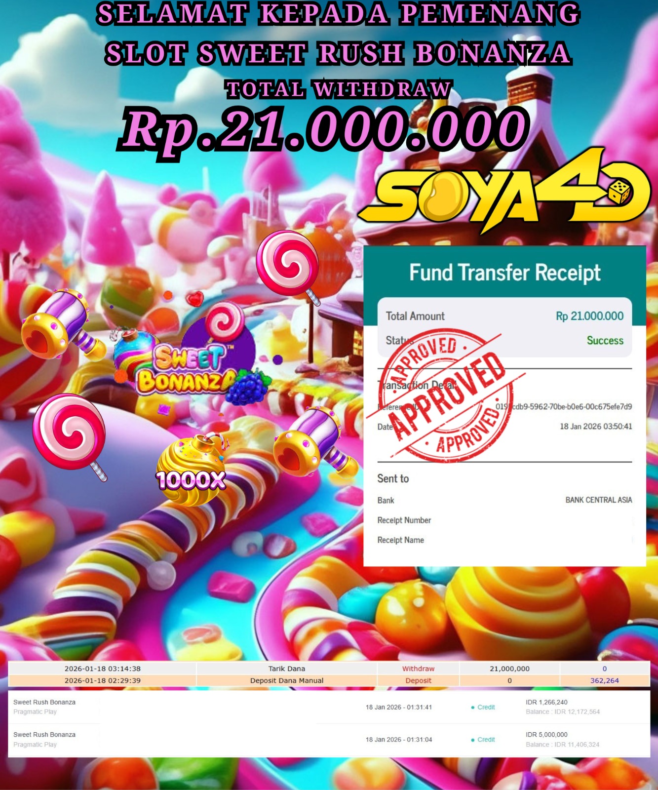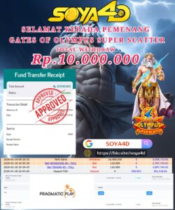 Selamat kepada Userid : Niu**** Telah berhasil mendapatkan kemenangan besar pada permainan SLOT WILD APE . Dengan kemenangan Sebesar Rp. 19.000.000.-. Setelah mengisi formulir withdraw dengan kurang waktu hanya 1 – 10 menit pihak SOYA4D sudah melakukan transfer kepada pemilik user id. Dan dana sudah masuk ke rekening id tersebut oleh pemenang. Bukti pembayaran yang kami berikan merupakan bukti pembayaran yang SAH / VALID yang langsung di dapatkan melalui tanda transfer transaksi berhasil dari Bank yang di tuju. Kami juga mengucapakan banyak Terima Kasih Kepada pemenang karena sudah mempercayakan kami sebagai Bandar Tepercaya yang membayar semua kemenangan member hingga lunas.