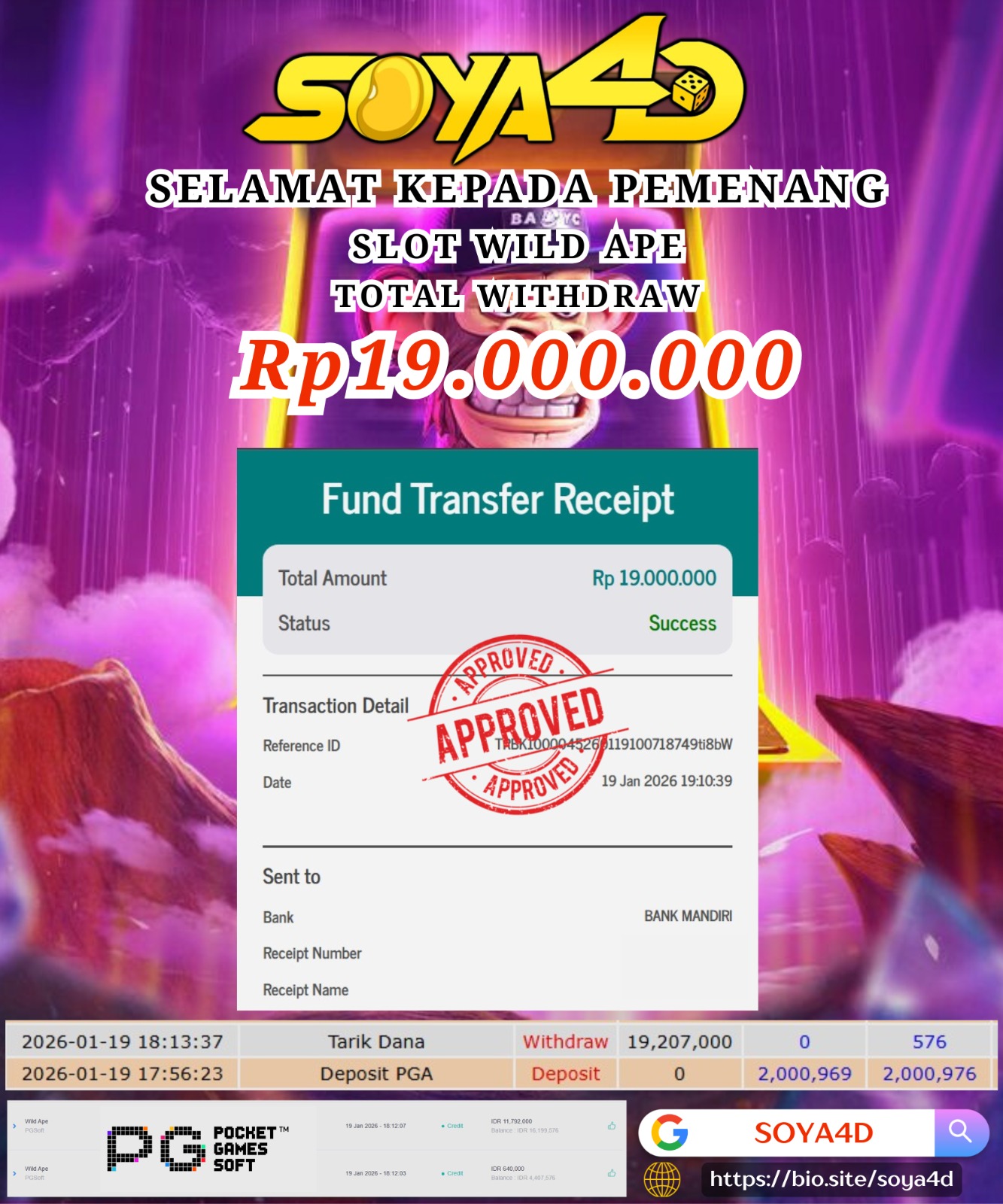 SOYA4D BUKTI JP SLOT WILD APE Rp. 19.000.000, -LUNAS
