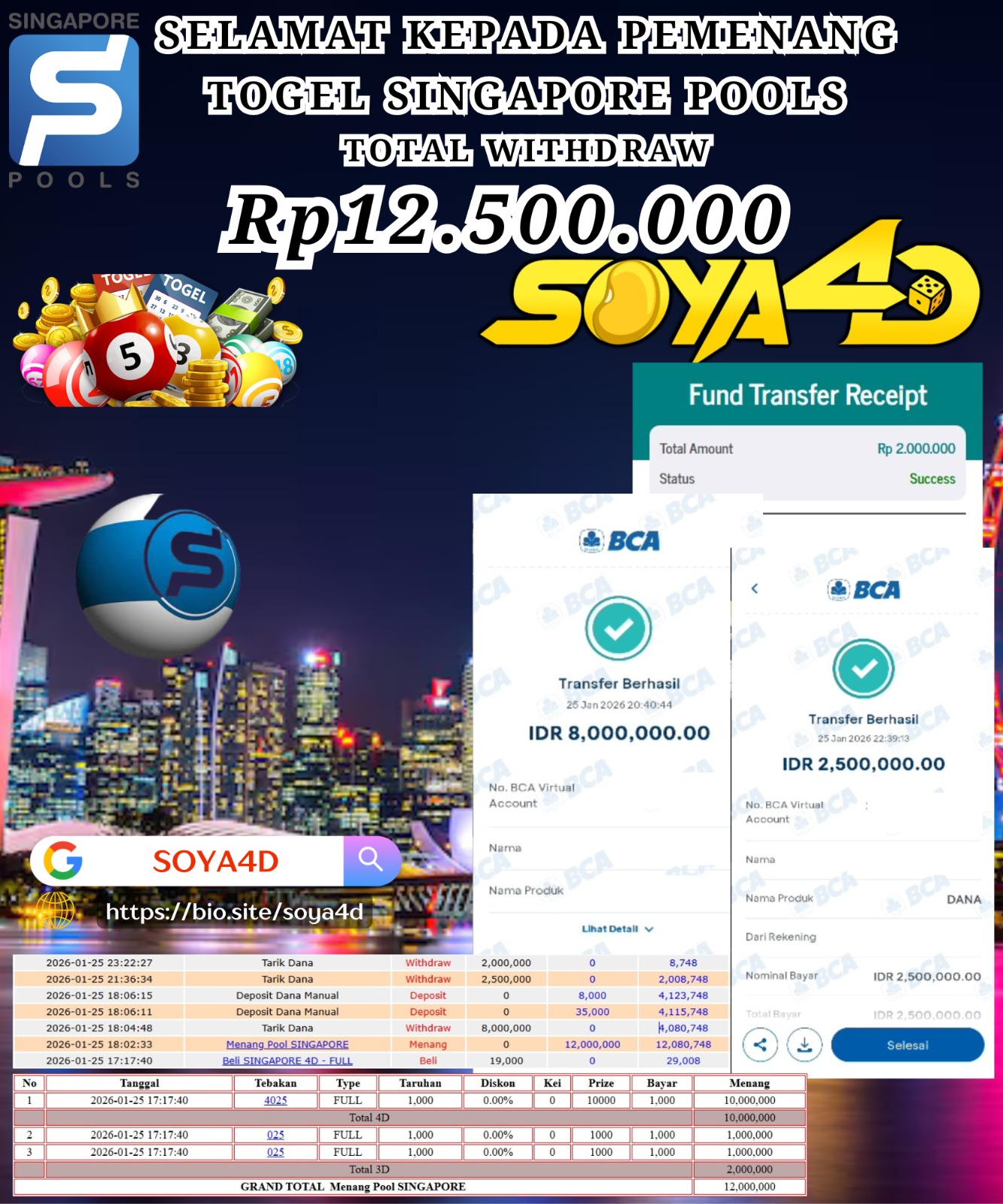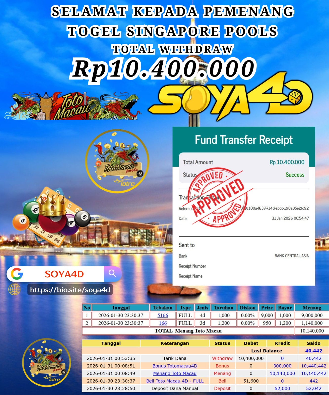 Masih ragu dengan SOYA4D bos ? Di mana bandar togel online sekarang yang terpercaya seperti SOYA 4D? Bandar yang mengirimkan kemenangan member tanpa bertele – tele. Jadi,,, tidak perlu khawatir pada situs SOYA 4D karena kemenangan anda berapapun akan dibayarakan hingga lunas kepada pemenang.