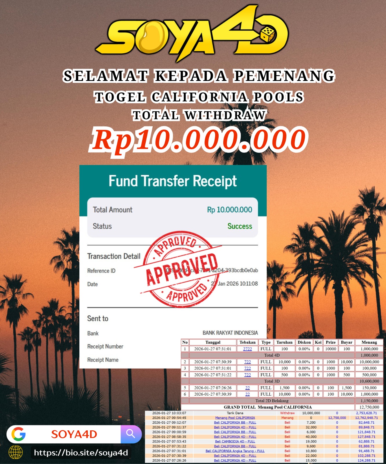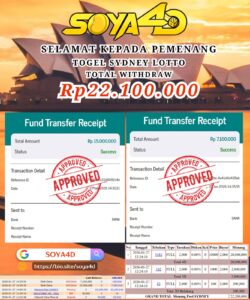 Selamat kepada Userid : Duo***** Telah berhasil mendapatkan kemenangan besar pada permainan SLOT OISHI DELIGHTS DAN TOGEL SYDNEY LOTTO. Dengan kemenangan Sebesar Rp. 11.900.000.-. Setelah mengisi formulir withdraw dengan kurang waktu hanya 1 – 10 menit pihak SOYA4D sudah melakukan transfer kepada pemilik user id. Dan dana sudah masuk ke rekening id tersebut oleh pemenang. Bukti pembayaran yang kami berikan merupakan bukti pembayaran yang SAH / VALID yang langsung di dapatkan melalui tanda transfer transaksi berhasil dari Bank yang di tuju. Kami juga mengucapakan banyak Terima Kasih Kepada pemenang karena sudah mempercayakan kami sebagai Bandar Tepercaya yang membayar semua kemenangan member hingga lunas.