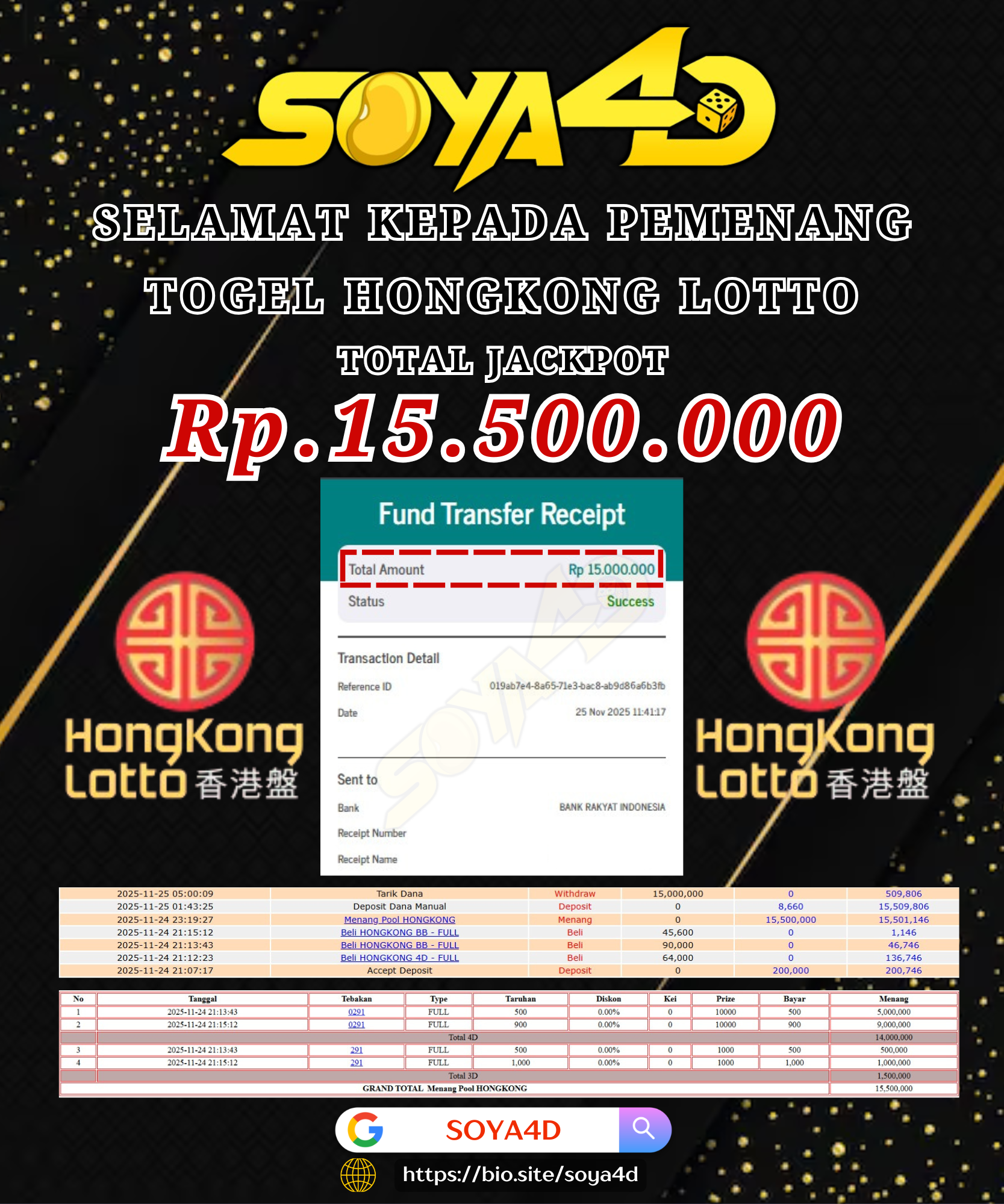 Selamat kepada User id : AM**** Telah berhasil mendapatkan kemenangan besar pada permainan TOGEL JAPAN POOLS. Dengan kemenangan Sebesar Rp.10.000.000.- Setelah mengisi formulir withdraw dengan kurang waktu hanya 1 – 10 menit pihak SOYA4D sudah melakukan transfer kepada pemilik user id dan dana sudah masuk ke rekening id tersebut oleh pemenang. Bukti pembayaran yang kami berikan merupakan bukti pembayaran yang SAH / VALID yang langsung di dapatkan melalui tanda transfer transaksi berhasil dari Bank yang di tuju.