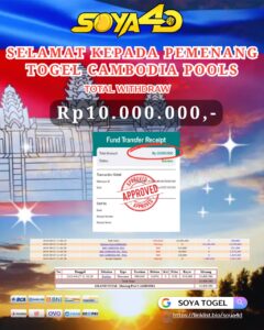 Selamat kepada User id : Rom**** Telah berhasil mendapatkan kemenangan besar pada permainan TOGEL SINGAPORE TOTO Dengan kemenangan Sebesar Rp.110.409.500,-Setelah mengisi formulir withdraw dengan kurung waktu hanya 1 – 10 menit pihak SOYA 4D sudah melakukan transfer kepada pemiliknya dan dana sudah masuk ke rekeNing id tersebut oleh pemenang. Bukti pembayaran yang kami berikan merupakan bukti pembayaran yang SAH / VALID yang langsung di dapatkan melalui tanda transfer transaksi berhasil dari Bank yang di tuju.