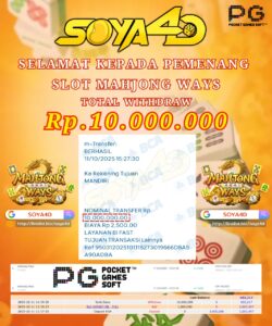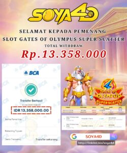 Selamat kepada User id : SIYA**** Telah berhasil mendapatkan kemenangan besar pada permainan SLOT GATES OF OLYMPUS SUPER SCATTER Dengan kemenangan Sebesar Rp.13.358.000.-,Setelah mengisi formulir withdraw dengan kurung waktu hanya 1 – 10 menit pihak SOYA 4D sudah melakukan transfer kepada pemiliknya dan dana sudah masuk ke rekeNing id tersebut oleh pemenang. Bukti pembayaran yang kami berikan merupakan bukti pembayaran yang SAH / VALID yang langsung di dapatkan melalui tanda transfer transaksi berhasil dari Bank yang di tuju.