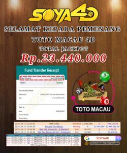 Kami mengucapakan banyak Terima Kasih Kepada pemenang karena sudah mempercayakan kami sebagai Bandar Tepercaya yang membayar semua kemenangan member hingga lunas Masih ragu dengan SOYA 4D bos ? Di mana bandar togel online sekarang yang terpercaya seperti SOYA4D ? Bandar yang mengirimkan kemenangan member tanpa bertele – tele. Jadi…. tidak perlu khawatir pada situs SOYA4D karena kemenangan anda berapapun akan dibayarakan hingga lunas kepada pemenang.