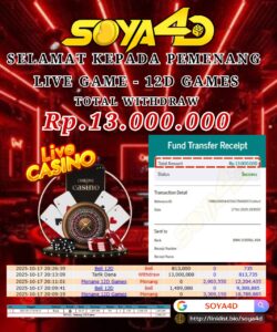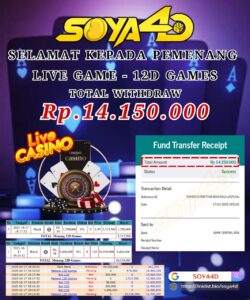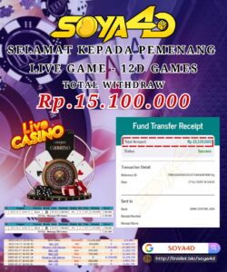 Selamat kepada User id : SAO**** Telah berhasil mendapatkan kemenangan besar pada permainan LIVE GAME 12D Dengan kemenangan Sebesar Rp.18.000.000.-,Setelah mengisi formulir withdraw dengan kurung waktu hanya 1 – 10 menit pihak SOYA 4D sudah melakukan transfer kepada pemiliknya dan dana sudah masuk ke rekeNing id tersebut oleh pemenang. Bukti pembayaran yang kami berikan merupakan bukti pembayaran yang SAH / VALID yang langsung di dapatkan melalui tanda transfer transaksi berhasil dari Bank yang di tuju.