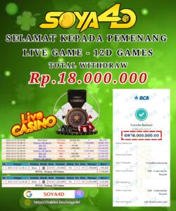 Selamat kepada User id : SAO**** Telah berhasil mendapatkan kemenangan besar pada permainan LIVE GAME 12D Dengan kemenangan Sebesar Rp.18.000.000.-,Setelah mengisi formulir withdraw dengan kurung waktu hanya 1 – 10 menit pihak SOYA 4D sudah melakukan transfer kepada pemiliknya dan dana sudah masuk ke rekeNing id tersebut oleh pemenang. Bukti pembayaran yang kami berikan merupakan bukti pembayaran yang SAH / VALID yang langsung di dapatkan melalui tanda transfer transaksi berhasil dari Bank yang di tuju.