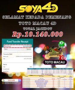 Selamat kepada User id : SAO**** Telah berhasil mendapatkan kemenangan besar pada permainan TOTO MACAU 4D Dengan kemenangan Sebesar Rp.10.140.000.-,Setelah mengisi formulir withdraw dengan kurung waktu hanya 1 – 10 menit pihak SOYA 4D sudah melakukan transfer kepada pemiliknya dan dana sudah masuk ke rekeNing id tersebut oleh pemenang. Bukti pembayaran yang kami berikan merupakan bukti pembayaran yang SAH / VALID yang langsung di dapatkan melalui tanda transfer transaksi berhasil dari Bank yang di tuju.