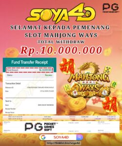 Selamat kepada User id : PIR**** Telah berhasil mendapatkan kemenangan besar pada permainan SLOT MAHJONG WAYS Dengan kemenangan Sebesar Rp.10.000.000.-,Setelah mengisi formulir withdraw dengan kurung waktu hanya 1 – 10 menit pihak SOYA 4D sudah melakukan transfer kepada pemiliknya dan dana sudah masuk ke rekeNing id tersebut oleh pemenang. Bukti pembayaran yang kami berikan merupakan bukti pembayaran yang SAH / VALID yang langsung di dapatkan melalui tanda transfer transaksi berhasil dari Bank yang di tuju.