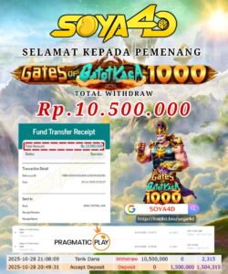 Selamat kepada User id : BIR**** Telah berhasil mendapatkan kemenangan besar pada permainan SLOT GATES OF GATOT KACA 1000 Dengan kemenangan Sebesar Rp.10.500.000.-,Setelah mengisi formulir withdraw dengan kurung waktu hanya 1 – 10 menit pihak SOYA 4D sudah melakukan transfer kepada pemiliknya dan dana sudah masuk ke rekeNing id tersebut oleh pemenang. Bukti pembayaran yang kami berikan merupakan bukti pembayaran yang SAH / VALID yang langsung di dapatkan melalui tanda transfer transaksi berhasil dari Bank yang di tuju.