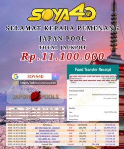 Selamat kepada User id : UNI**** Telah berhasil mendapatkan kemenangan besar pada permainan JAPAN POOL Dengan kemenangan Sebesar Rp.11.100.000.-,Setelah mengisi formulir withdraw dengan kurung waktu hanya 1 – 10 menit pihak SOYA 4D sudah melakukan transfer kepada pemiliknya dan dana sudah masuk ke rekeNing id tersebut oleh pemenang. Bukti pembayaran yang kami berikan merupakan bukti pembayaran yang SAH / VALID yang langsung di dapatkan melalui tanda transfer transaksi berhasil dari Bank yang di tuju.