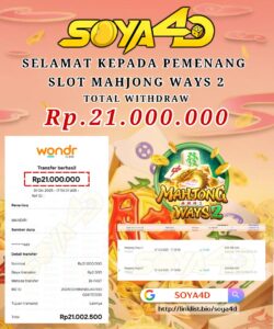 Selamat kepada User id : SAR**** Telah berhasil mendapatkan kemenangan besar pada permainan SLOT MAHJONG WAYS 2 Dengan kemenangan Sebesar Rp.21.000.000.-,Setelah mengisi formulir withdraw dengan kurung waktu hanya 1 – 10 menit pihak SOYA 4D sudah melakukan transfer kepada pemiliknya dan dana sudah masuk ke rekeNing id tersebut oleh pemenang. Bukti pembayaran yang kami berikan merupakan bukti pembayaran yang SAH / VALID yang langsung di dapatkan melalui tanda transfer transaksi berhasil dari Bank yang di tuju.