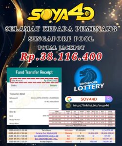 Selamat kepada User id : KHA**** Telah berhasil mendapatkan kemenangan besar pada permainan TOGEL SINGAPORE POOL Dengan kemenangan Sebesar Rp.38.116.400.- Setelah mengisi formulir withdraw dengan kurung waktu hanya 1 – 10 menit pihak SOYA 4D sudah melakukan transfer kepada pemiliknya dan dana sudah masuk ke rekeNing id tersebut oleh pemenang. Bukti pembayaran yang kami berikan merupakan bukti pembayaran yang SAH / VALID yang langsung di dapatkan melalui tanda transfer transaksi berhasil dari Bank yang di tuju.