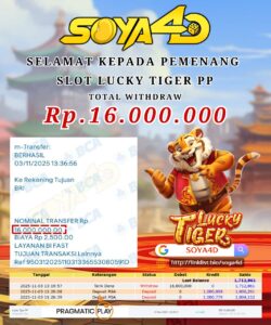 Selamat kepada User id : ALE**** Telah berhasil mendapatkan kemenangan besar pada permainan SLOT LUCKY TIGER PP Dengan kemenangan Sebesar Rp.16.000.000.- Setelah mengisi formulir withdraw dengan kurung waktu hanya 1 – 10 menit pihak SOYA 4D sudah melakukan transfer kepada pemiliknya dan dana sudah masuk ke rekeNing id tersebut oleh pemenang. Bukti pembayaran yang kami berikan merupakan bukti pembayaran yang SAH / VALID yang langsung di dapatkan melalui tanda transfer transaksi berhasil dari Bank yang di tuju.