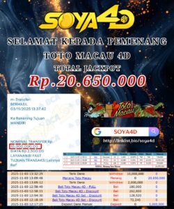 Selamat kepada User id : TUK**** Telah berhasil mendapatkan kemenangan besar pada permainan TOGEL TOTO MACAU 4DDengan kemenangan Sebesar Rp.20.650.000.- Setelah mengisi formulir withdraw dengan kurung waktu hanya 1 – 10 menit pihak SOYA 4D sudah melakukan transfer kepada pemiliknya dan dana sudah masuk ke rekeNing id tersebut oleh pemenang. Bukti pembayaran yang kami berikan merupakan bukti pembayaran yang SAH / VALID yang langsung di dapatkan melalui tanda transfer transaksi berhasil dari Bank yang di tuju.