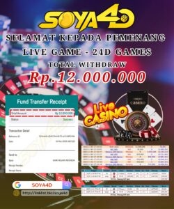 Selamat kepada User id : JEN**** Telah berhasil mendapatkan kemenangan besar pada permainan LIVE GAME – 24D Dengan kemenangan Sebesar Rp.12.000.000.-,Setelah mengisi formulir withdraw dengan kurung waktu hanya 1 – 10 menit pihak SOYA 4D sudah melakukan transfer kepada pemiliknya dan dana sudah masuk ke rekeNing id tersebut oleh pemenang. Bukti pembayaran yang kami berikan merupakan bukti pembayaran yang SAH / VALID yang langsung di dapatkan melalui tanda transfer transaksi berhasil dari Bank yang di tuju.