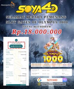 Selamat kepada User id : ARJ**** Telah berhasil mendapatkan kemenangan besar pada permainan SLOT GATES OF OLYMPUS 1000 Dengan kemenangan Sebesar Rp.18.000.000.-,Setelah mengisi formulir withdraw dengan kurung waktu hanya 1 – 10 menit pihak SOYA 4D sudah melakukan transfer kepada pemiliknya dan dana sudah masuk ke rekeNing id tersebut oleh pemenang. Bukti pembayaran yang kami berikan merupakan bukti pembayaran yang SAH / VALID yang langsung di dapatkan melalui tanda transfer transaksi berhasil dari Bank yang di tuju.