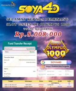 Selamat kepada User id : MON**** Telah berhasil mendapatkan kemenangan besar pada permainan SLOT GATES OF OLYMPUS 1000 Dengan kemenangan Sebesar Rp.8.008.000.-,Setelah mengisi formulir withdraw dengan kurung waktu hanya 1 – 10 menit pihak SOYA 4D sudah melakukan transfer kepada pemiliknya dan dana sudah masuk ke rekeNing id tersebut oleh pemenang. Bukti pembayaran yang kami berikan merupakan bukti pembayaran yang SAH / VALID yang langsung di dapatkan melalui tanda transfer transaksi berhasil dari Bank yang di tuju.