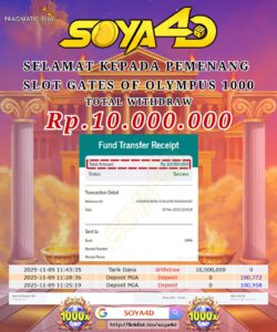 Selamat kepada User id : dv**** Telah berhasil mendapatkan kemenangan besar pada permainan SLOT GATES OF OLYMPUS 1000 Dengan kemenangan Sebesar Rp.10.000.000.-, Setelah mengisi formulir withdraw dengan kurung waktu hanya 1 – 10 menit pihak SOYA 4D sudah melakukan transfer kepada pemiliknya dan dana sudah masuk ke rekening id tersebut oleh pemenang. Bukti pembayaran yang kami berikan merupakan bukti pembayaran yang SAH / VALID yang langsung di dapatkan melalui tanda transfer transaksi berhasil dari Bank yang di tuju.