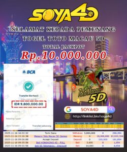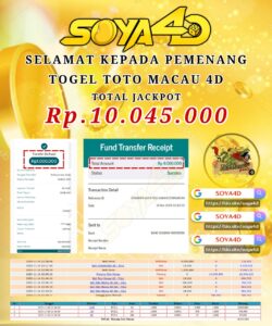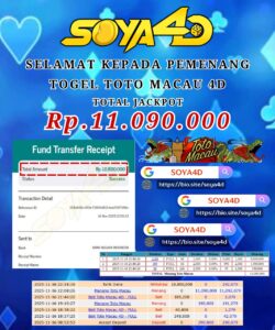 Selamat kepada User id : KH***** Telah berhasil mendapatkan kemenangan besar pada permainan TOGEL TOTO MACAU 4D Dengan kemenangan Sebesar Rp.10.800.000.-,Setelah mengisi formulir withdraw dengan kurang waktu hanya 1 – 10 menit pihak SOYA 4D sudah melakukan transfer kepada pemiliknya dan dana sudah masuk ke rekeNing id tersebut oleh pemenang. Bukti pembayaran yang kami berikan merupakan bukti pembayaran yang SAH / VALID yang langsung di dapatkan melalui tanda transfer transaksi berhasil dari Bank yang di tuju.