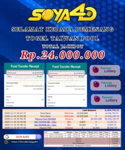 Selamat kepada User id : soy***** Telah berhasil mendapatkan kemenangan besar pada permainan TOGEL TAIWAN POOL Dengan kemenangan Sebesar Rp.24.000.000.-,Setelah mengisi formulir withdraw dengan kurang waktu hanya 1 – 10 menit pihak SOYA 4D sudah melakukan transfer kepada pemiliknya dan dana sudah masuk ke rekeNing id tersebut oleh pemenang. Bukti pembayaran yang kami berikan merupakan bukti pembayaran yang SAH / VALID yang langsung di dapatkan melalui tanda transfer transaksi berhasil dari Bank yang di tuju.