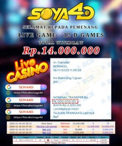 Selamat kepada User id : rus**** Telah berhasil mendapatkan kemenangan besar pada permainan LIVE GAME – 12 D GAMES Dengan kemenangan Sebesar Rp.14.000.000.-,Setelah mengisi formulir withdraw dengan kurang waktu hanya 1 – 10 menit pihak SOYA 4D sudah melakukan transfer kepada pemiliknya dan dana sudah masuk ke rekeNing id tersebut oleh pemenang. Bukti pembayaran yang kami berikan merupakan bukti pembayaran yang SAH / VALID yang langsung di dapatkan melalui tanda transfer transaksi berhasil dari Bank yang di tuju.