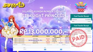 Selamat kepada User id : Poi**** Telah berhasil mendapatkan kemenangan besar pada permainan SLOT STARLIGHT PRINCESS Dengan kemenangan Sebesar Rp.13.000.000.-,Setelah mengisi formulir withdraw dengan kurang waktu hanya 1 – 10 menit pihak SOYA 4D sudah melakukan transfer kepada pemiliknya dan dana sudah masuk ke rekeNing id tersebut oleh pemenang. Bukti pembayaran yang kami berikan merupakan bukti pembayaran yang SAH / VALID yang langsung di dapatkan melalui tanda transfer transaksi berhasil dari Bank yang di tuju.