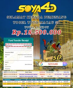 Selamat kepada User id : BIR***** Telah berhasil mendapatkan kemenangan besar pada permainan TOGEL TOTO MACAU 5D Dengan kemenangan Sebesar Rp.18.500.000.-,Setelah mengisi formulir withdraw dengan kurung waktu hanya 1 – 10 menit pihak SOYA 4D sudah melakukan transfer kepada pemiliknya dan dana sudah masuk ke rekeNing id tersebut oleh pemenang. Bukti pembayaran yang kami berikan merupakan bukti pembayaran yang SAH / VALID yang langsung di dapatkan melalui tanda transfer transaksi berhasil dari Bank yang di tuju.