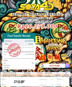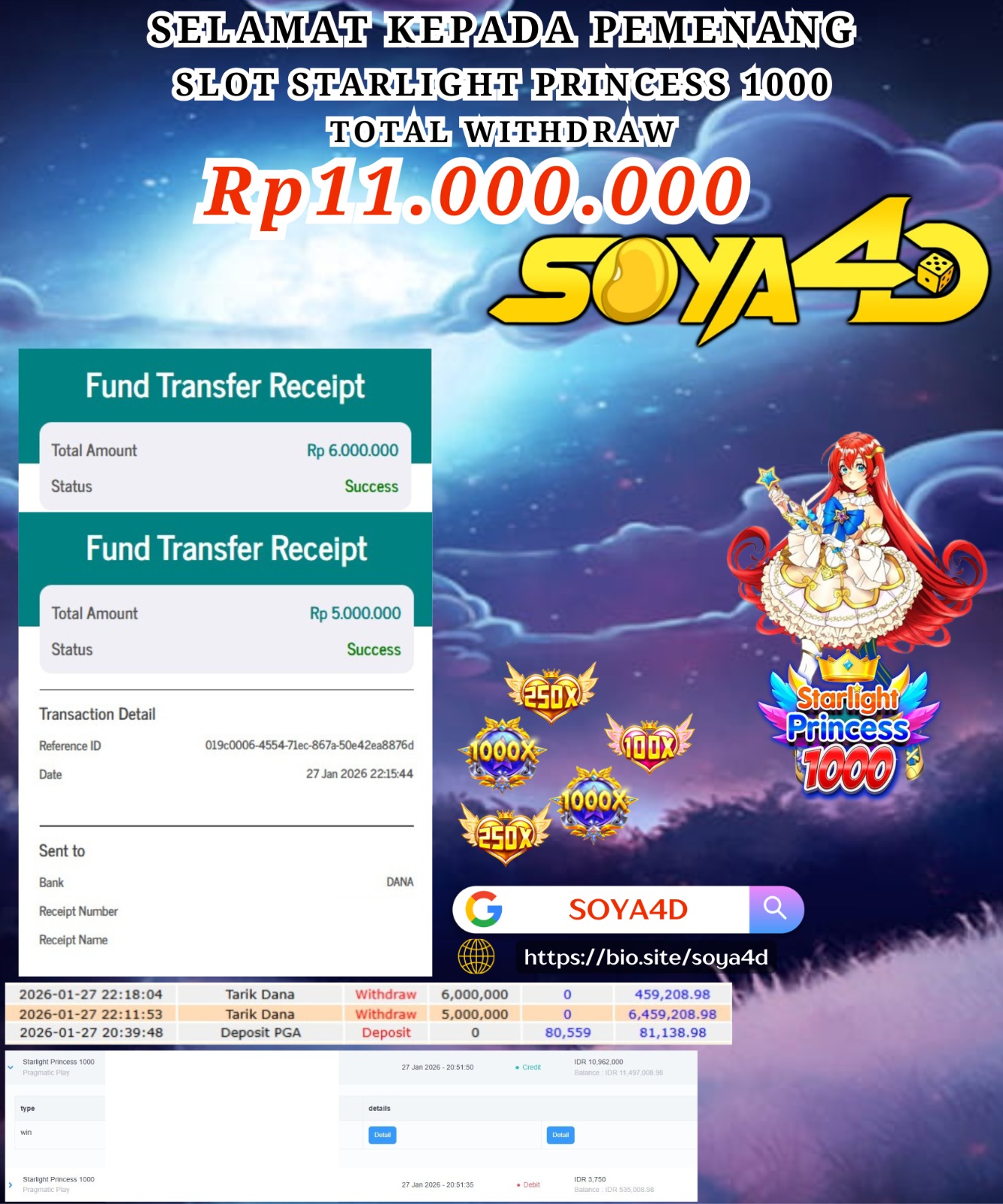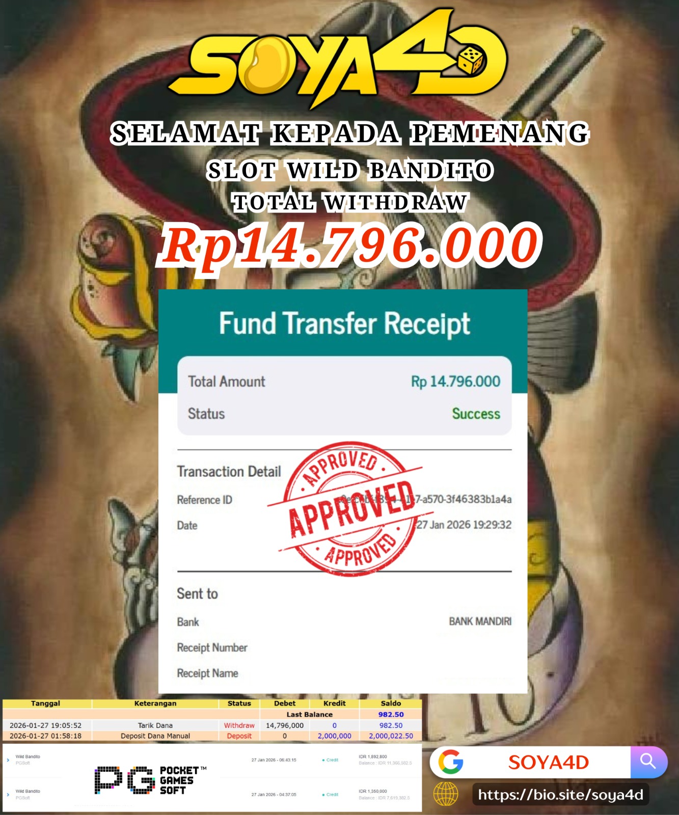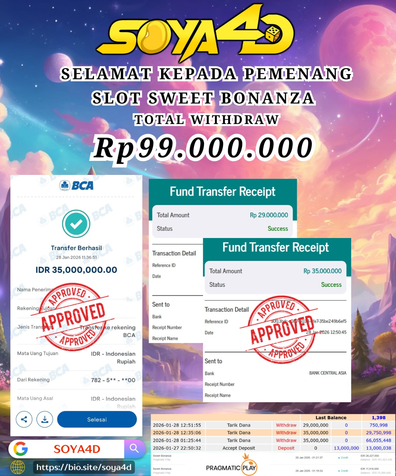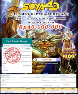 Selamat kepada Userid : Dad**** Telah berhasil mendapatkan kemenangan besar pada permainan SLOT SWEET BONANZA . Dengan kemenangan Sebesar Rp. 99.000.000.-. Setelah mengisi formulir withdraw dengan kurang waktu hanya 1 – 10 menit pihak SOYA4D sudah melakukan transfer kepada pemilik user id. Dan dana sudah masuk ke rekening id tersebut oleh pemenang. Bukti pembayaran yang kami berikan merupakan bukti pembayaran yang SAH / VALID yang langsung di dapatkan melalui tanda transfer transaksi berhasil dari Bank yang di tuju. Kami juga mengucapakan banyak Terima Kasih Kepada pemenang karena sudah mempercayakan kami sebagai Bandar Tepercaya yang membayar semua kemenangan member hingga lunas.