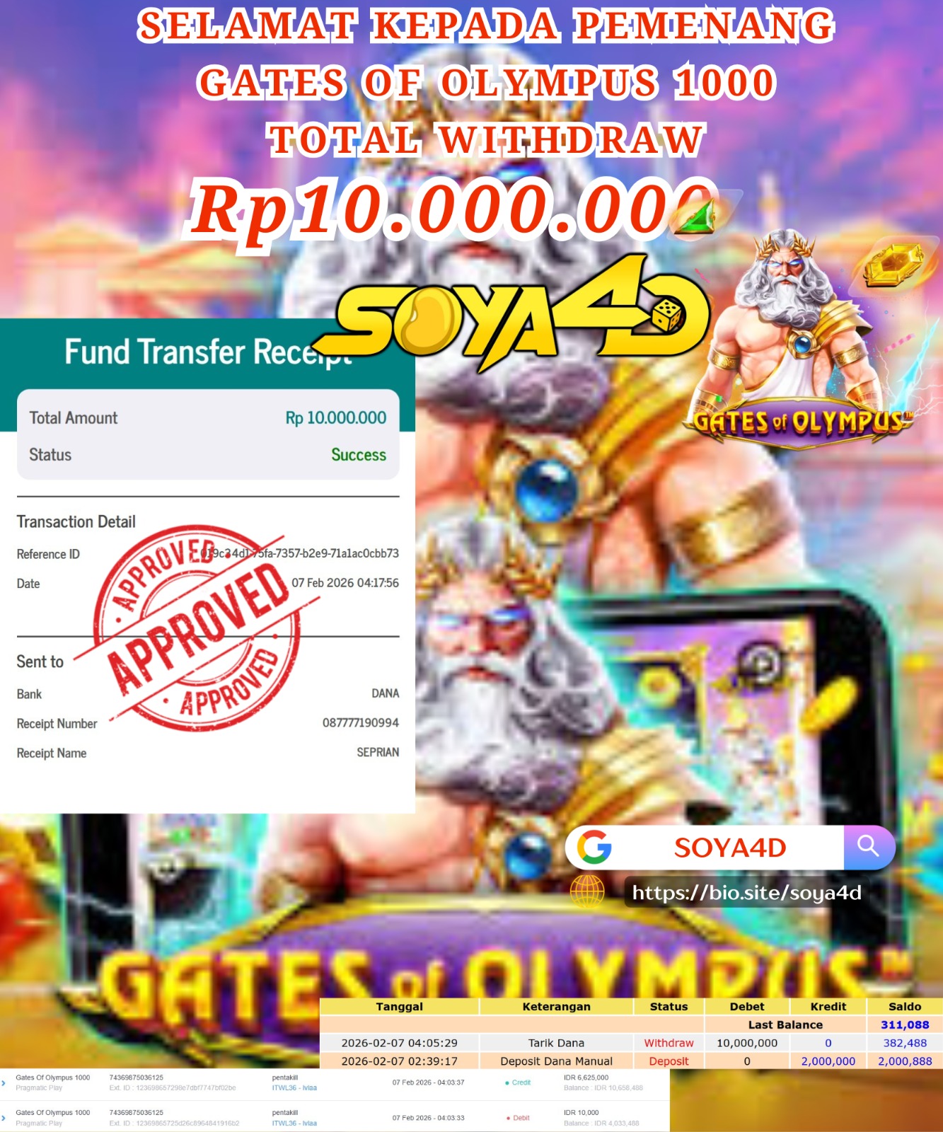 Selamat kepada Userid : NGH**** Telah berhasil mendapatkan kemenangan besar pada permainan GATES OF OLYMPUS 1000. Dengan kemenangan Sebesar Rp. 10.000.000.-. Setelah mengisi formulir withdraw dengan kurang waktu hanya 1 – 10 menit pihak SOYA4D sudah melakukan transfer kepada pemilik user id. Dan dana sudah masuk ke rekening id tersebut oleh pemenang. Bukti pembayaran yang kami berikan merupakan bukti pembayaran yang SAH / VALID yang langsung di dapatkan melalui tanda transfer transaksi berhasil dari Bank yang di tuju. Kami juga mengucapakan banyak Terima Kasih Kepada pemenang karena sudah mempercayakan kami sebagai Bandar Tepercaya yang membayar semua kemenangan member hingga lunas.