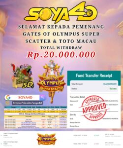 . Dengan kemenangan Sebesar Rp.20.000.000.-. Setelah mengisi formulir withdraw dengan kurang waktu hanya 1 – 10 menit pihak SOYA4D sudah melakukan transfer kepada pemilik user id. Dan dana sudah masuk ke rekening id tersebut oleh pemenang. Bukti pembayaran yang kami berikan merupakan bukti pembayaran yang SAH / VALID yang langsung di dapatkan melalui tanda transfer transaksi berhasil dari Bank yang di tuju.