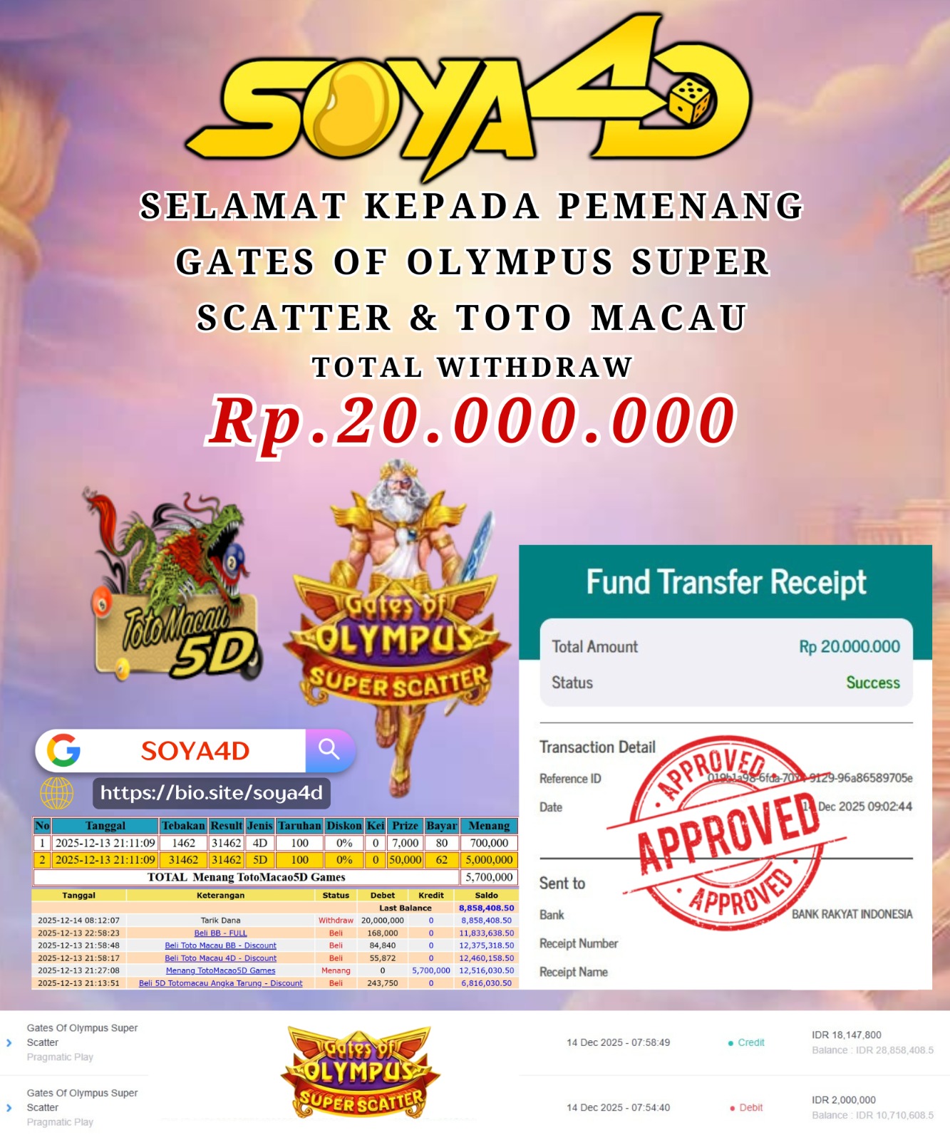 . Dengan kemenangan Sebesar Rp.20.000.000.-. Setelah mengisi formulir withdraw dengan kurang waktu hanya 1 – 10 menit pihak SOYA4D sudah melakukan transfer kepada pemilik user id. Dan dana sudah masuk ke rekening id tersebut oleh pemenang. Bukti pembayaran yang kami berikan merupakan bukti pembayaran yang SAH / VALID yang langsung di dapatkan melalui tanda transfer transaksi berhasil dari Bank yang di tuju.