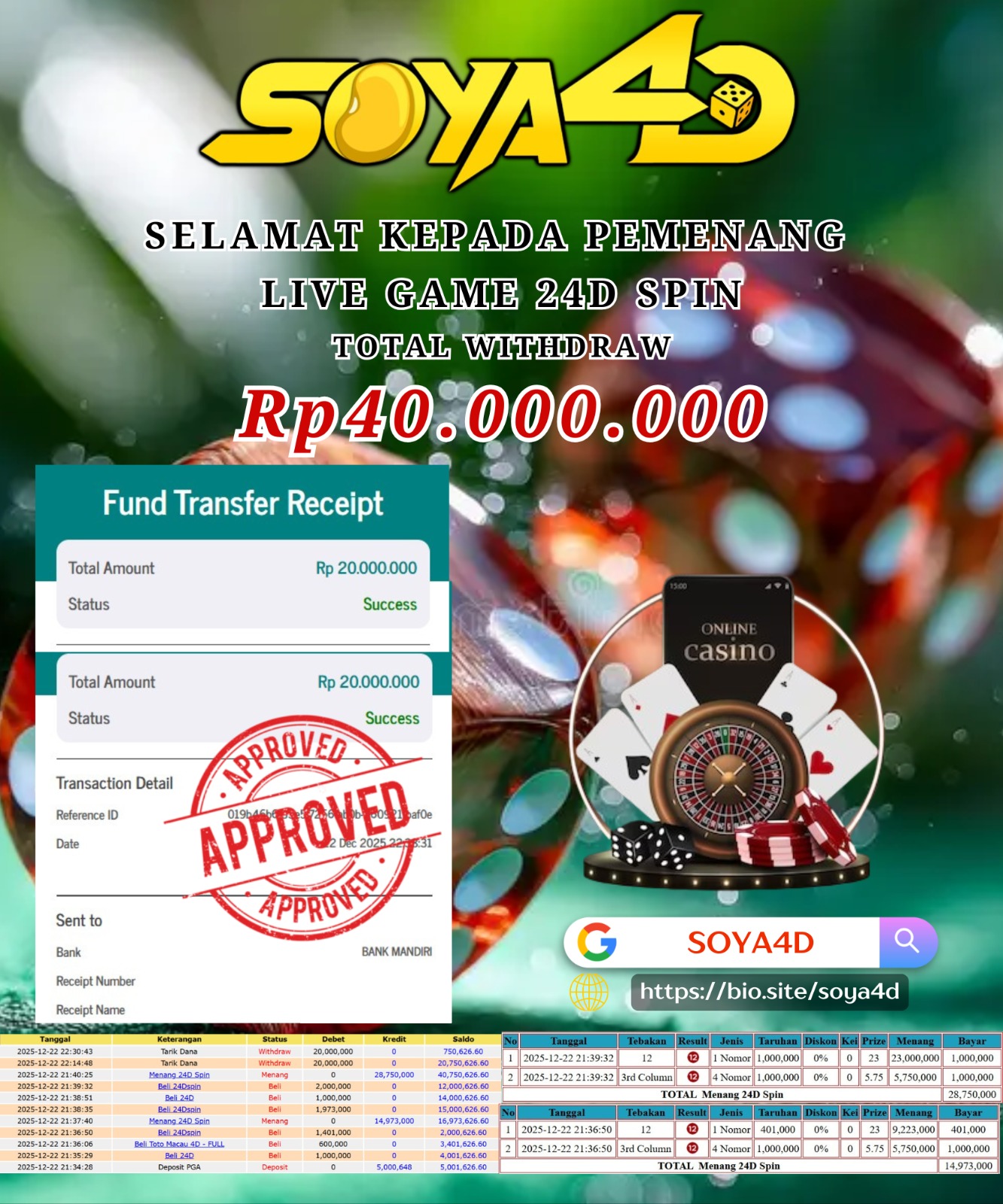 Selamat kepada Userid : Vam**** Telah berhasil mendapatkan kemenangan besar pada permainan LIVE GAME 24D SPIN . Dengan kemenangan Sebesar Rp. 40.000.000.-. Setelah mengisi formulir withdraw dengan kurang waktu hanya 1 – 10 menit pihak SOYA4D  sudah melakukan transfer kepada pemilik user id. Dan dana sudah masuk ke rekening id tersebut oleh pemenang. Bukti pembayaran yang kami berikan merupakan bukti pembayaran yang SAH / VALID yang langsung di dapatkan melalui tanda transfer transaksi berhasil dari Bank yang di tuju.