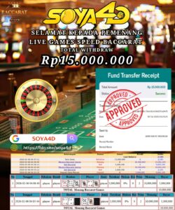 Selamat kepada Userid : Amo**** Telah berhasil mendapatkan kemenangan besar pada permainan LIVE GAMES SPEED BACCARAT. Dengan kemenangan Sebesar Rp. 15.000.000.-. Setelah mengisi formulir withdraw dengan kurang waktu hanya 1 – 10 menit pihak SOYA4D  sudah melakukan transfer kepada pemilik user id. Dan dana sudah masuk ke rekening id tersebut oleh pemenang. Bukti pembayaran yang kami berikan merupakan bukti pembayaran yang SAH / VALID yang langsung di dapatkan melalui tanda transfer transaksi berhasil dari Bank yang di tuju. Kami juga mengucapakan banyak Terima Kasih Kepada pemenang karena sudah mempercayakan kami sebagai Bandar Tepercaya yang membayar semua kemenangan member hingga lunas.