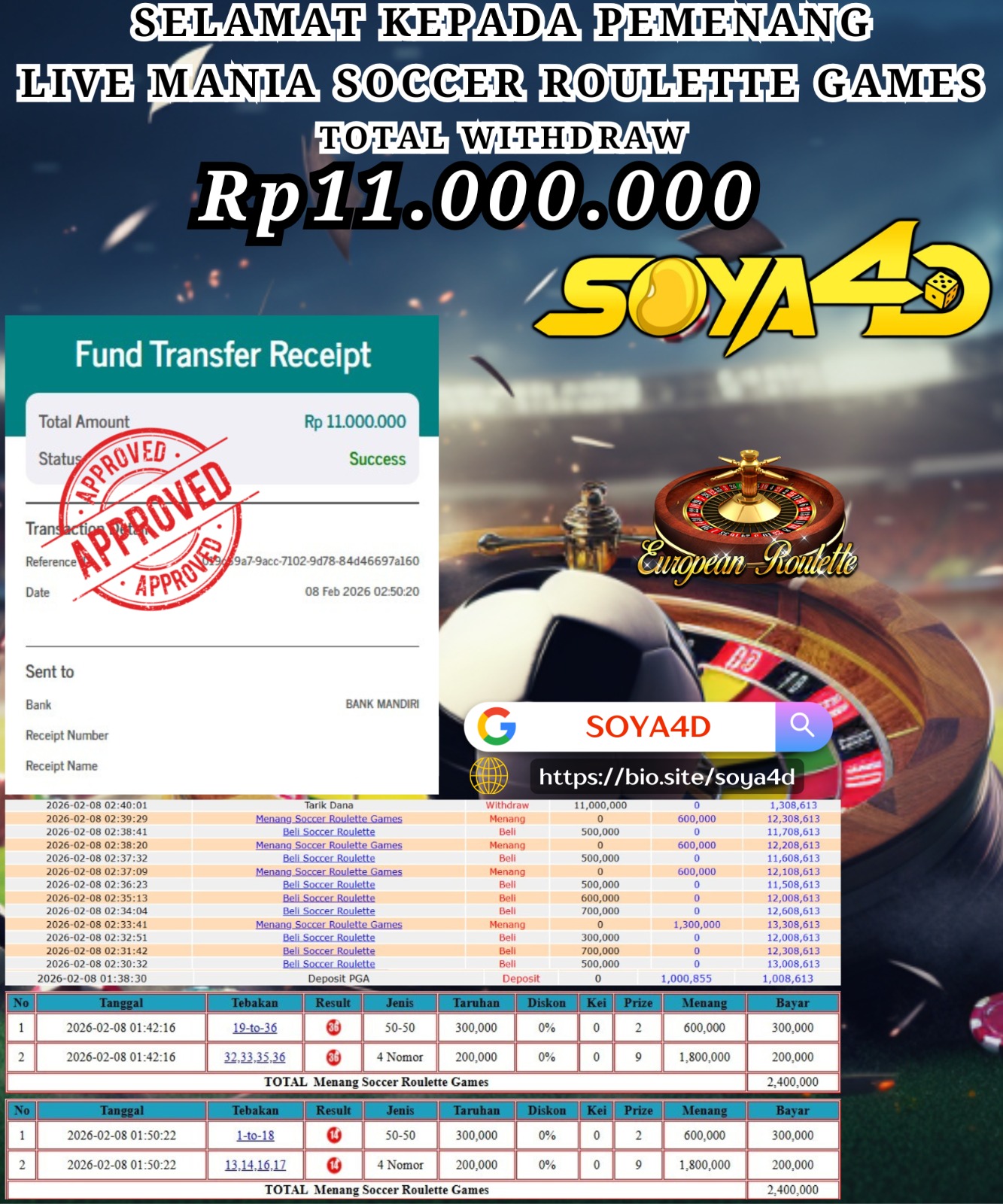 Selamat kepada Userid : Ant*** Telah berhasil mendapatkan kemenangan besar pada permainan LIVE MANIA SOCCER ROULETTE GAMES. Dengan kemenangan Sebesar Rp. 11.000.000.-. Setelah mengisi formulir withdraw dengan kurang waktu hanya 1 – 10 menit pihak SOYA4D sudah melakukan transfer kepada pemilik user id. Dan dana sudah masuk ke rekening id tersebut oleh pemenang. Bukti pembayaran yang kami berikan merupakan bukti pembayaran yang SAH / VALID yang langsung di dapatkan melalui tanda transfer transaksi berhasil dari Bank yang di tuju. Kami juga mengucapakan banyak Terima Kasih Kepada pemenang karena sudah mempercayakan kami sebagai Bandar Tepercaya yang membayar semua kemenangan member hingga lunas.
