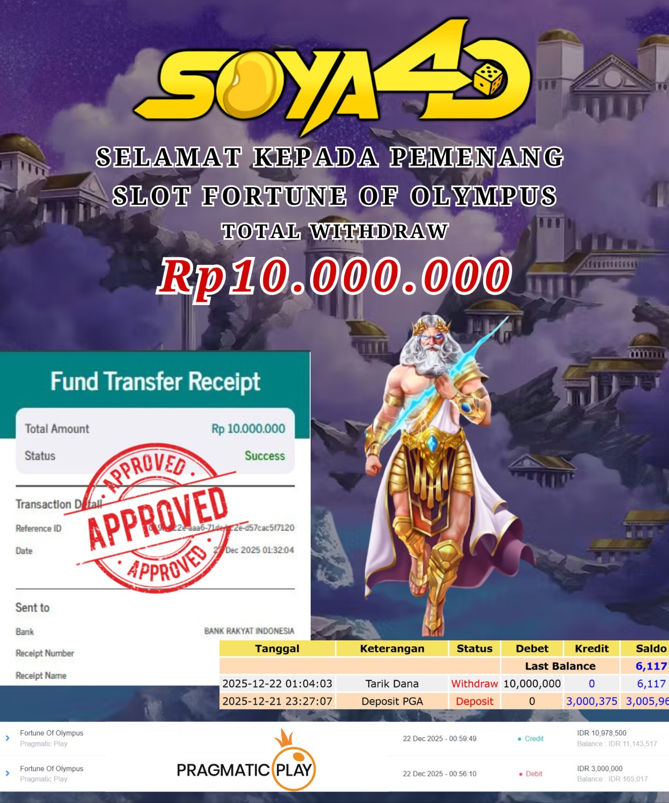 Selamat kepada Userid : Iam**** Telah berhasil mendapatkan kemenangan besar pada permainan SLOT FORTUNE OF OLYMPUS . Dengan kemenangan Sebesar Rp. 10.000.000.-. Setelah mengisi formulir withdraw dengan kurang waktu hanya 1 – 10 menit pihak SOYA4D sudah melakukan transfer kepada pemilik user id. Dan dana sudah masuk ke rekening id tersebut oleh pemenang. Bukti pembayaran yang kami berikan merupakan bukti pembayaran yang SAH / VALID yang langsung di dapatkan melalui tanda transfer transaksi berhasil dari Bank yang di tuju.