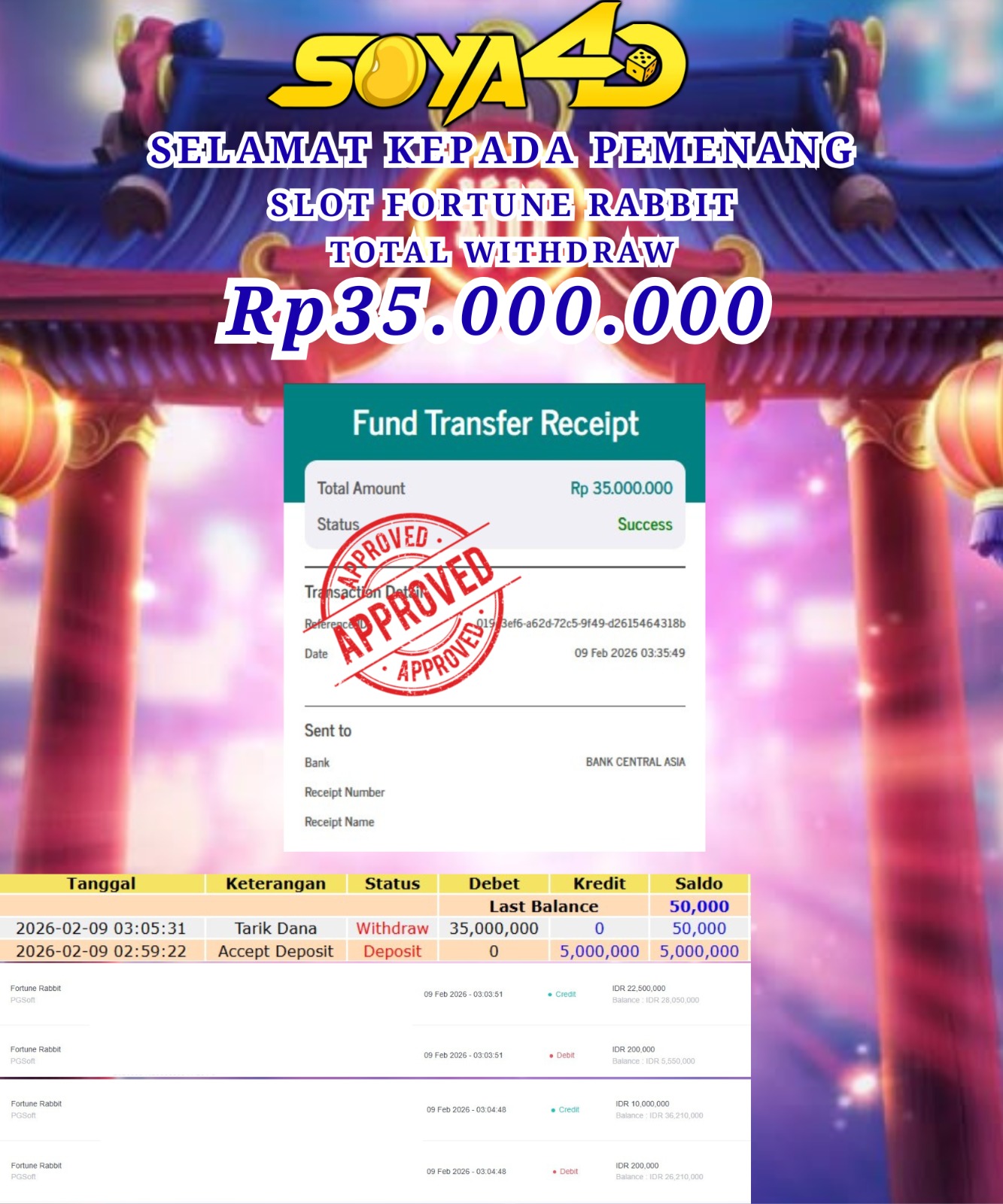 Selamat kepada Userid : Bai*** Telah berhasil mendapatkan kemenangan besar pada permainan SLOT FORTUNE RABBIT. Dengan kemenangan Sebesar Rp. 35.000.000.-. Setelah mengisi formulir withdraw dengan kurang waktu hanya 1 – 10 menit pihak SOYA4D sudah melakukan transfer kepada pemilik user id. Dan dana sudah masuk ke rekening id tersebut oleh pemenang. Bukti pembayaran yang kami berikan merupakan bukti pembayaran yang SAH / VALID yang langsung di dapatkan melalui tanda transfer transaksi berhasil dari Bank yang di tuju. Kami juga mengucapakan banyak Terima Kasih Kepada pemenang karena sudah mempercayakan kami sebagai Bandar Tepercaya yang membayar semua kemenangan member hingga lunas.