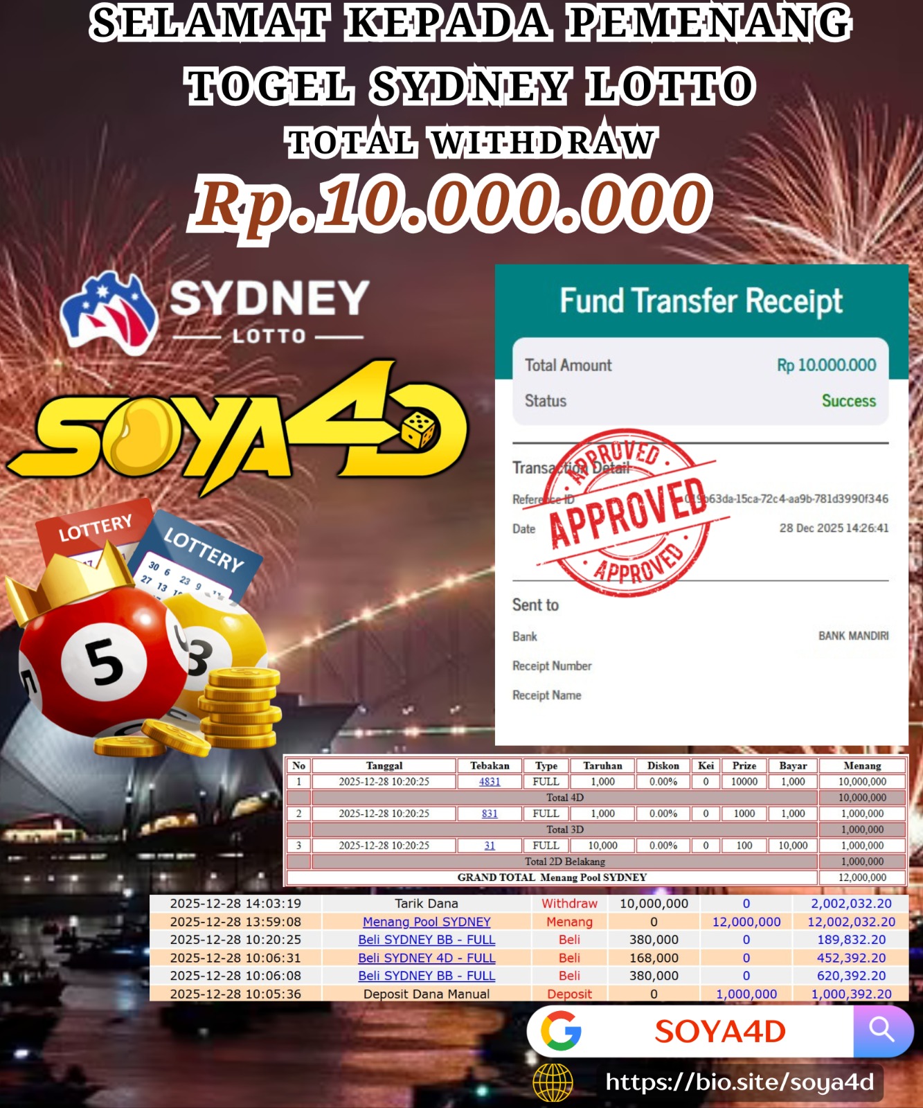 Selamat kepada Userid : Nam***** Telah berhasil mendapatkan kemenangan besar pada permainan TOGEL SYDNEY LOTTO . Dengan kemenangan Sebesar Rp. 10.000.000.-. Setelah mengisi formulir withdraw dengan kurang waktu hanya 1 – 10 menit pihak SOYA4D sudah melakukan transfer kepada pemilik user id. Dan dana sudah masuk ke rekening id tersebut oleh pemenang. Bukti pembayaran yang kami berikan merupakan bukti pembayaran yang SAH / VALID yang langsung di dapatkan melalui tanda transfer transaksi berhasil dari Bank yang di tuju.