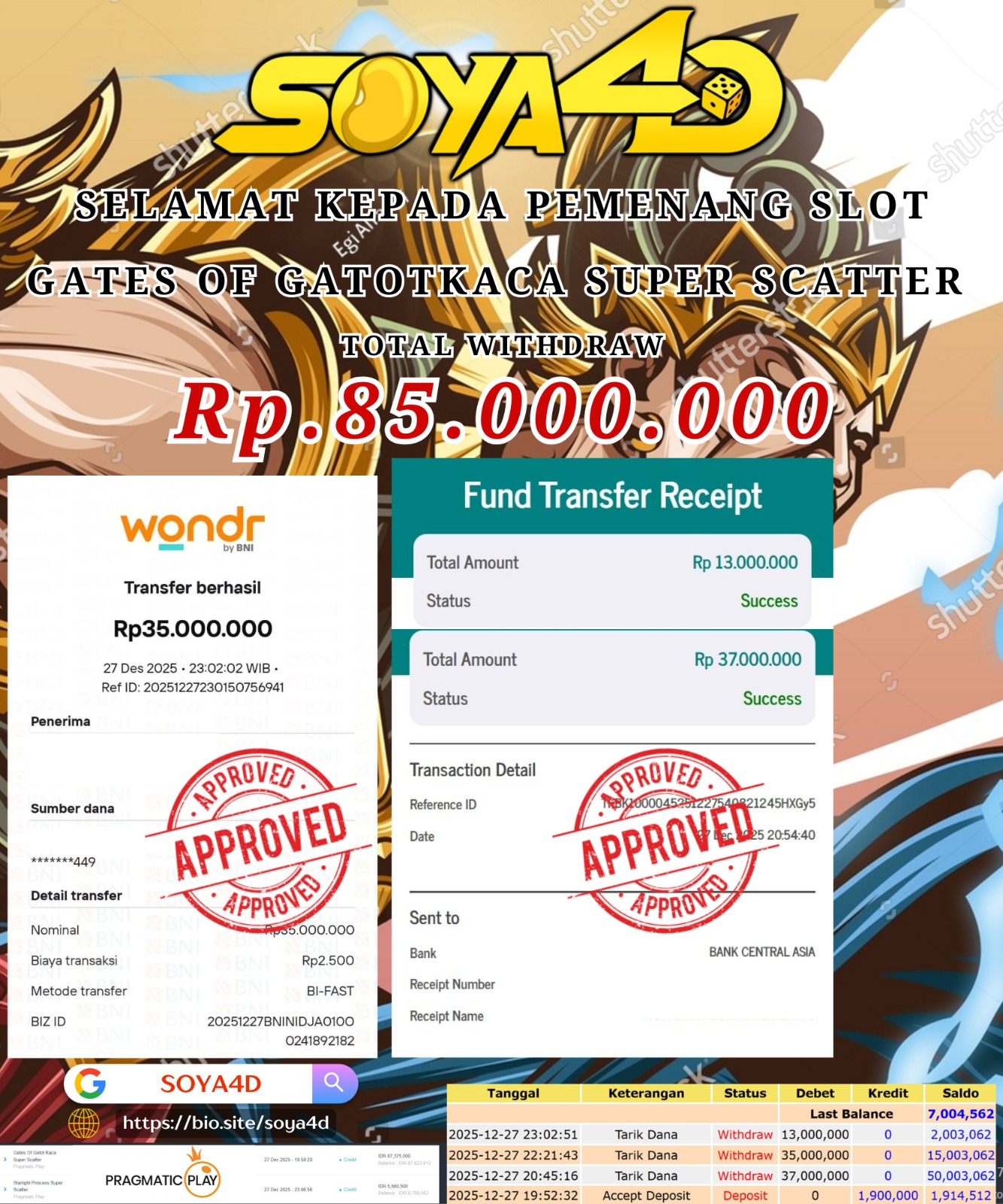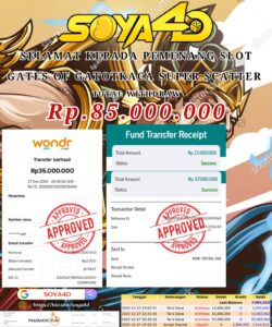 Selamat kepada Userid : Bos***** Telah berhasil mendapatkan kemenangan besar pada permainan SLOT GATES OF GATOT KACA SUPER SCATTER . Dengan kemenangan Sebesar Rp. 85.000.000.-. Setelah mengisi formulir withdraw dengan kurang waktu hanya 1 – 10 menit pihak SOYA4D sudah melakukan transfer kepada pemilik user id. Dan dana sudah masuk ke rekening id tersebut oleh pemenang. Bukti pembayaran yang kami berikan merupakan bukti pembayaran yang SAH / VALID yang langsung di dapatkan melalui tanda transfer transaksi berhasil dari Bank yang di tuju.