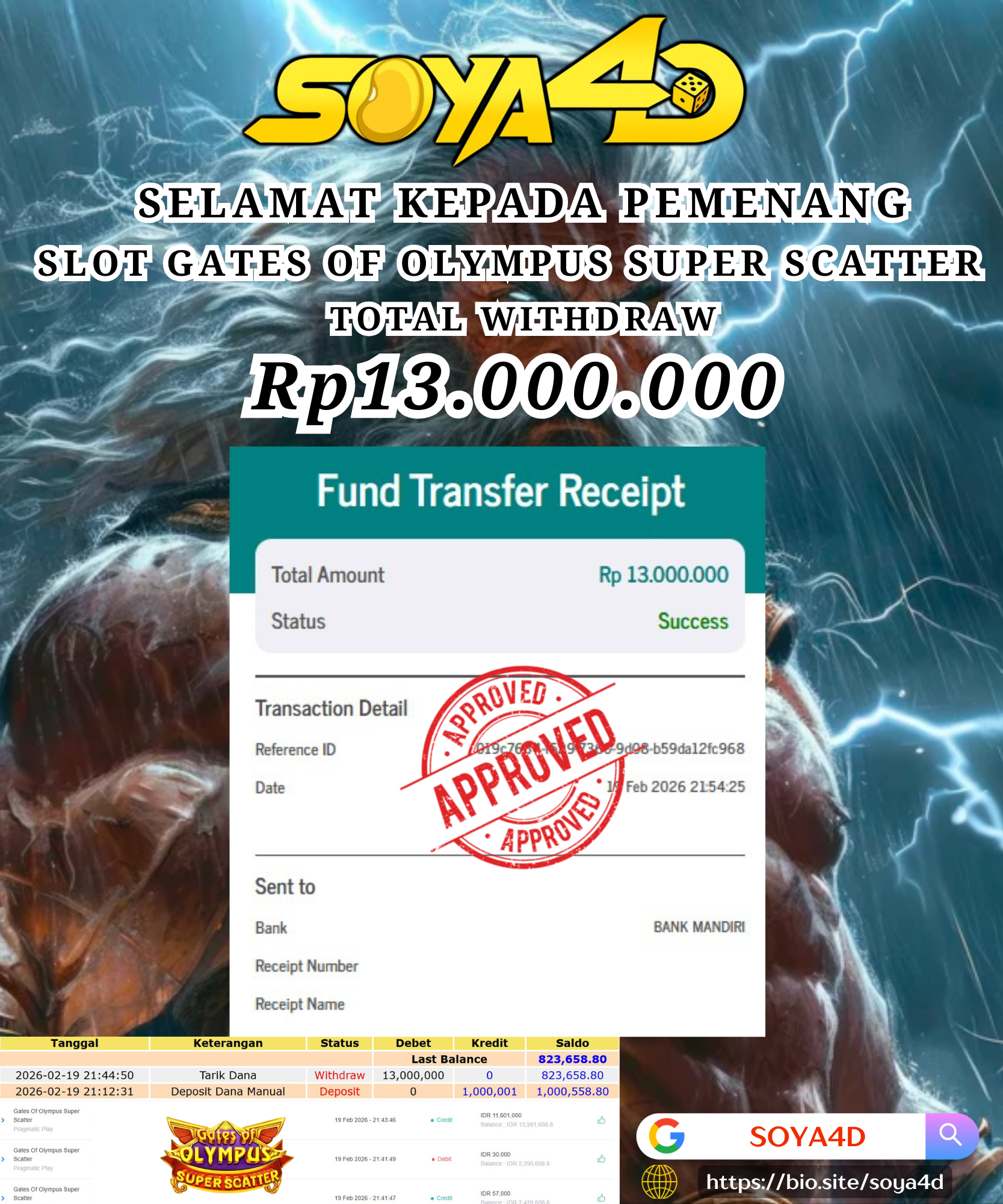Selamat kepada Userid : MIN***** Telah berhasil mendapatkan kemenangan besar pada permainan SLOT GATES OF OLMYPUS SUPER SCATTER . Dengan kemenangan Sebesar Rp.13.000.000.-. Setelah mengisi formulir withdraw dengan kurang waktu hanya 1 – 10 menit pihak SOYA4D sudah melakukan transfer kepada pemilik user id. Dan dana sudah masuk ke rekening id tersebut oleh pemenang. Bukti pembayaran yang kami berikan merupakan bukti pembayaran yang SAH / VALID yang langsung di dapatkan melalui tanda transfer transaksi berhasil dari Bank yang di tuju. Kami juga mengucapakan banyak Terima Kasih Kepada pemenang karena sudah mempercayakan kami sebagai Bandar Tepercaya yang membayar semua kemenangan member hingga lunas.