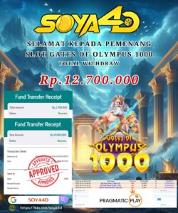 Selamat kepada Userid : Soi**** Telah berhasil mendapatkan kemenangan besar pada permainan SLOT GATES OF OLYMPUS 1000 . Dengan kemenangan Sebesar Rp.12.700.000.-. Setelah mengisi formulir withdraw dengan kurang waktu hanya 1 – 10 menit pihak SOYA4D sudah melakukan transfer kepada pemilik user id. Dan dana sudah masuk ke rekening id tersebut oleh pemenang. Bukti pembayaran yang kami berikan merupakan bukti pembayaran yang SAH / VALID yang langsung di dapatkan melalui tanda transfer transaksi berhasil dari Bank yang di tuju.