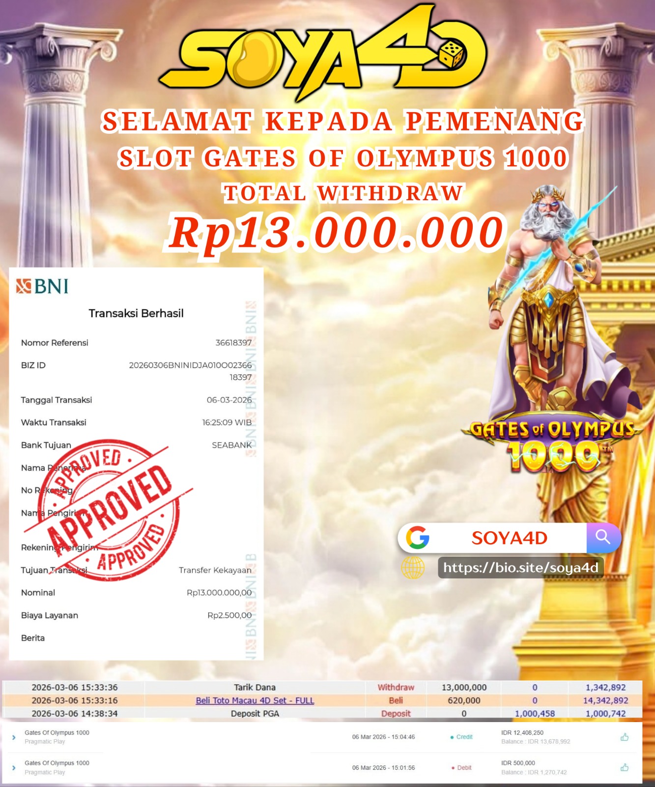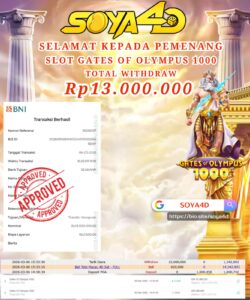 Selamat kepada Userid : Nyu***** Telah berhasil mendapatkan kemenangan besar pada permainan SLOT GATES OF OLYMPUS 1000 . Dengan kemenangan Sebesar Rp.  13.000.000.-. Setelah mengisi formulir withdraw dengan kurang waktu hanya 1 – 10 menit pihak SOYA4D  sudah melakukan transfer kepada pemilik user id. Dan dana sudah masuk ke rekening id tersebut oleh pemenang. Bukti pembayaran yang kami berikan merupakan bukti pembayaran yang SAH / VALID yang langsung di dapatkan melalui tanda transfer transaksi berhasil dari Bank yang di tuju. Kami juga mengucapakan banyak Terima Kasih Kepada pemenang karena sudah mempercayakan kami sebagai Bandar Tepercaya yang membayar semua kemenangan member hingga lunas.