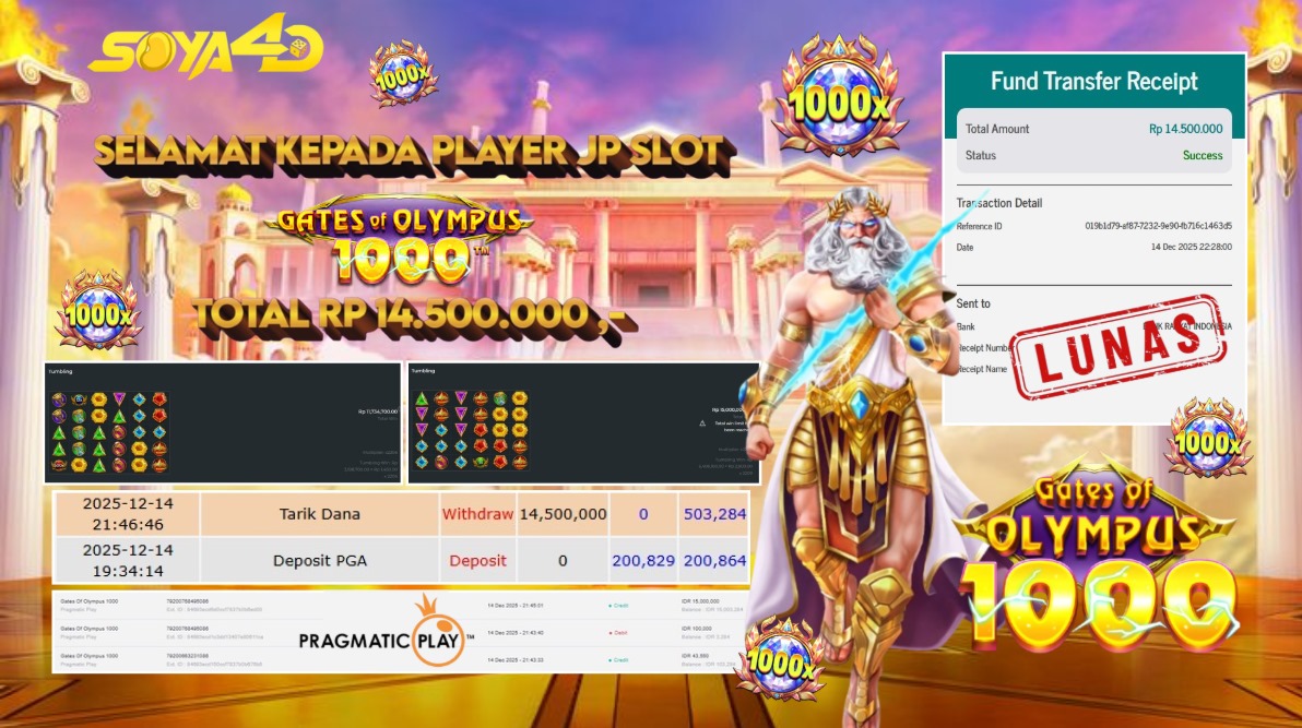 Selamat kepada Userid : SO**** Telah berhasil mendapatkan kemenangan besar pada permainan SLOT GATES OF OLYMPUS 1000 . Dengan kemenangan Sebesar Rp.14.500.000.-. Setelah mengisi formulir withdraw dengan kurang waktu hanya 1 – 10 menit pihak SOYA4D sudah melakukan transfer kepada pemilik user id. Dan dana sudah masuk ke rekening id tersebut oleh pemenang. Bukti pembayaran yang kami berikan merupakan bukti pembayaran yang SAH / VALID yang langsung di dapatkan melalui tanda transfer transaksi berhasil dari Bank yang di tuju.