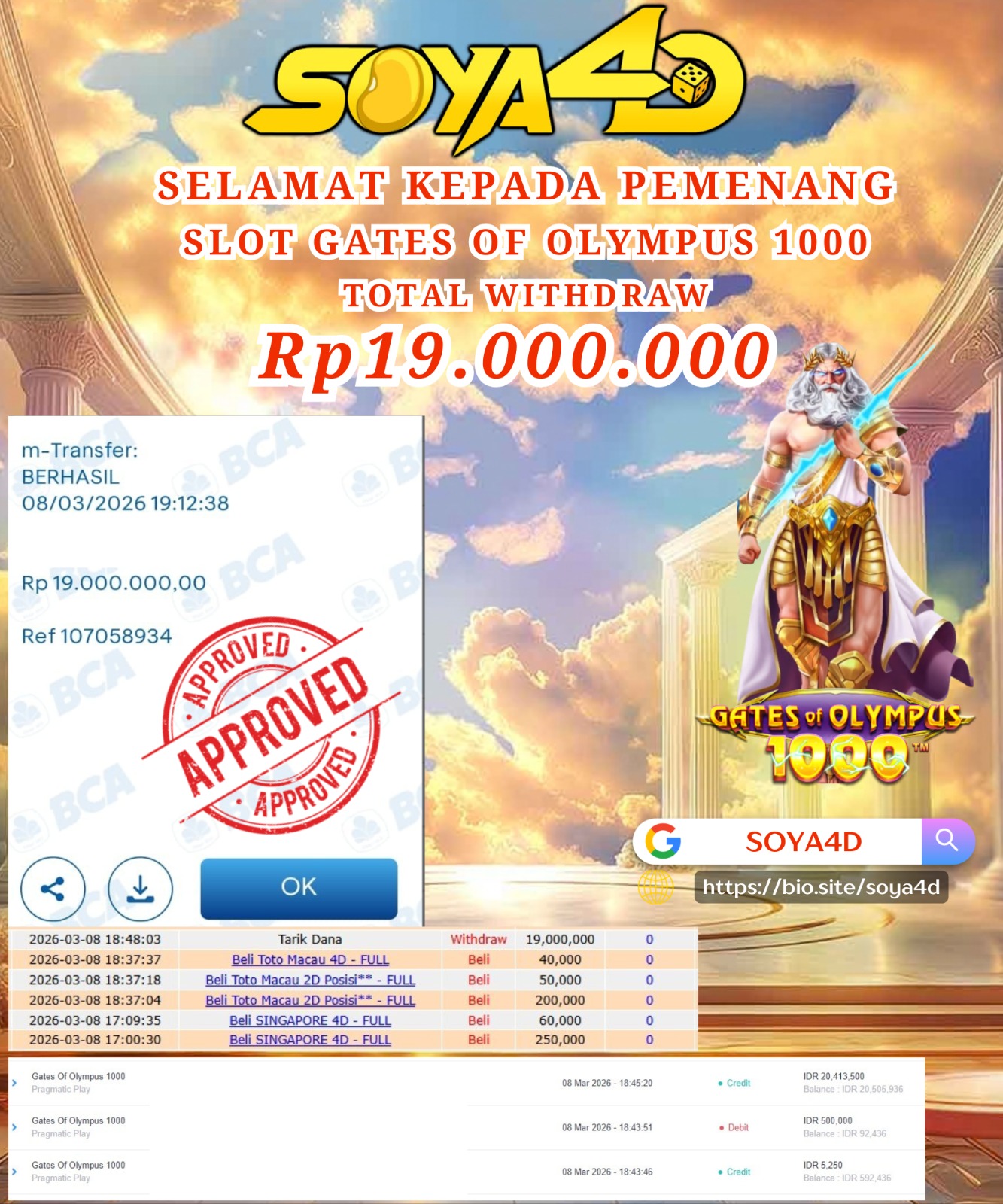Selamat kepada Userid : Sia***** Telah berhasil mendapatkan kemenangan besar pada permainan SLOT GATES OF OLYMPUS 1000 . Dengan kemenangan Sebesar Rp. 19.000.000.-. Setelah mengisi formulir withdraw dengan kurang waktu hanya 1 – 10 menit pihak SOYA4D sudah melakukan transfer kepada pemilik user id. Dan dana sudah masuk ke rekening id tersebut oleh pemenang. Bukti pembayaran yang kami berikan merupakan bukti pembayaran yang SAH / VALID yang langsung di dapatkan melalui tanda transfer transaksi berhasil dari Bank yang di tuju. Kami juga mengucapakan banyak Terima Kasih Kepada pemenang karena sudah mempercayakan kami sebagai Bandar Tepercaya yang membayar semua kemenangan member hingga lunas.