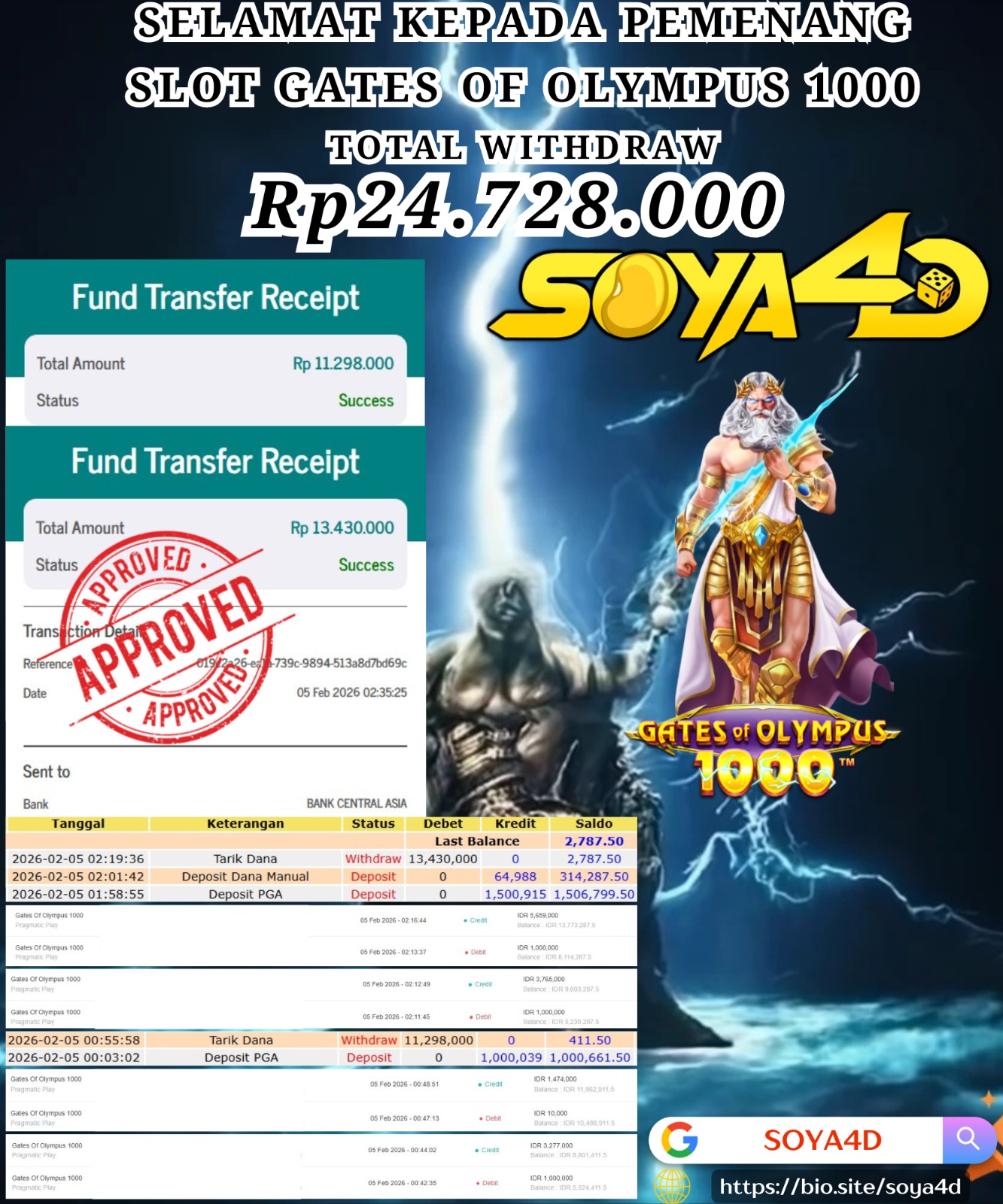 Selamat kepada Userid : Rhi***** Telah berhasil mendapatkan kemenangan besar pada permainan SLOT GATES OF OLYMPUS 1000. Dengan kemenangan Sebesar Rp. 24.728.000.-. Setelah mengisi formulir withdraw dengan kurang waktu hanya 1 – 10 menit pihak SOYA4D sudah melakukan transfer kepada pemilik user id. Dan dana sudah masuk ke rekening id tersebut oleh pemenang. Bukti pembayaran yang kami berikan merupakan bukti pembayaran yang SAH / VALID yang langsung di dapatkan melalui tanda transfer transaksi berhasil dari Bank yang di tuju. Kami juga mengucapakan banyak Terima Kasih Kepada pemenang karena sudah mempercayakan kami sebagai Bandar Tepercaya yang membayar semua kemenangan member hingga lunas.